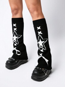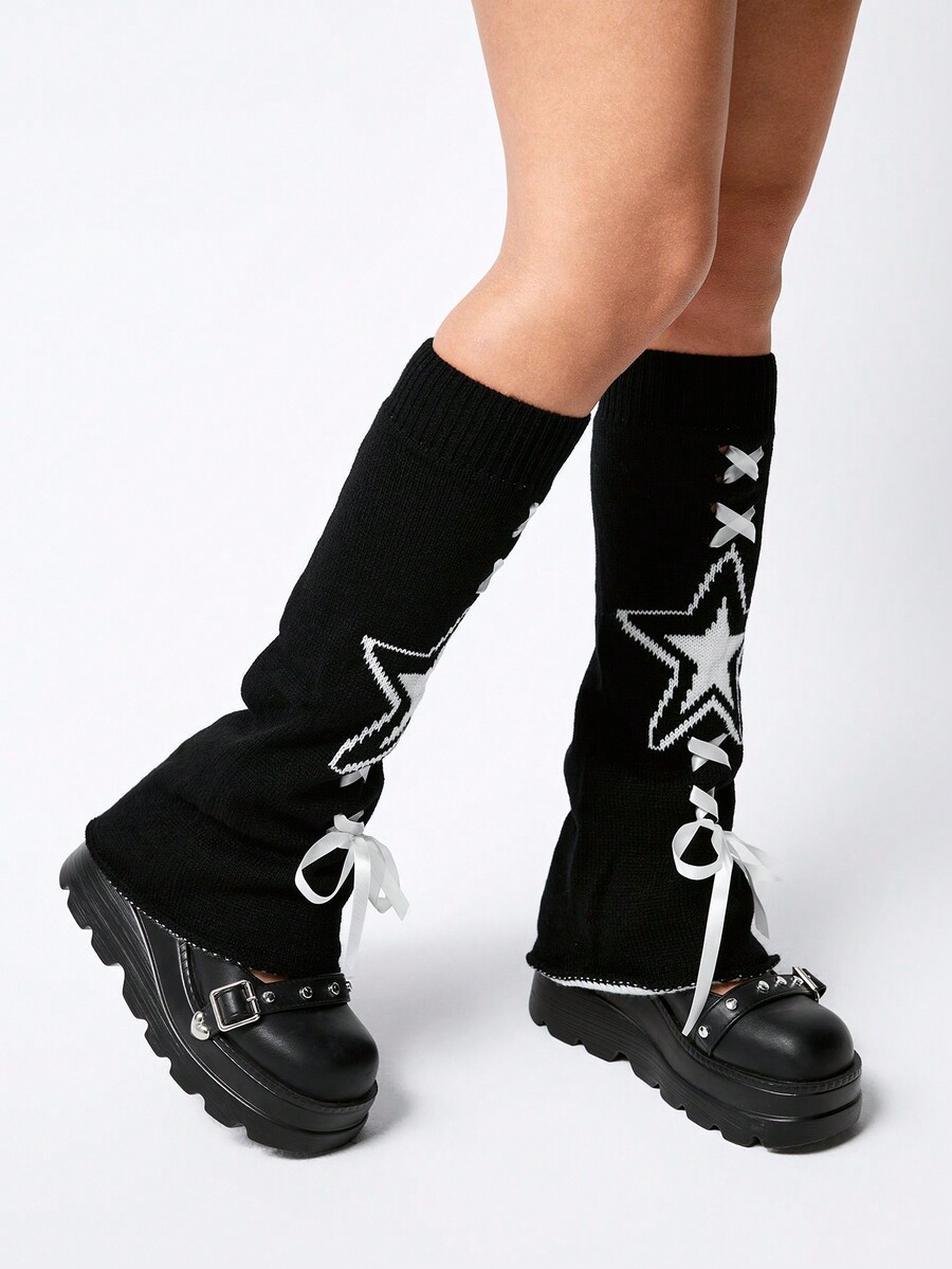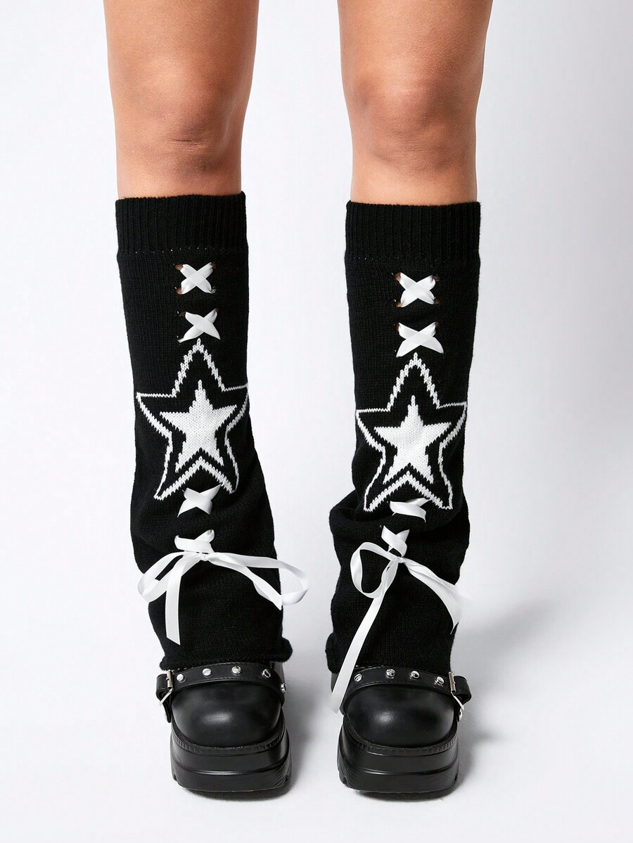 Kawaii 1 par de calentadores de piernas de estrella con cinta a rayas negra y blanca de estilo JK para todo el año para mujeres