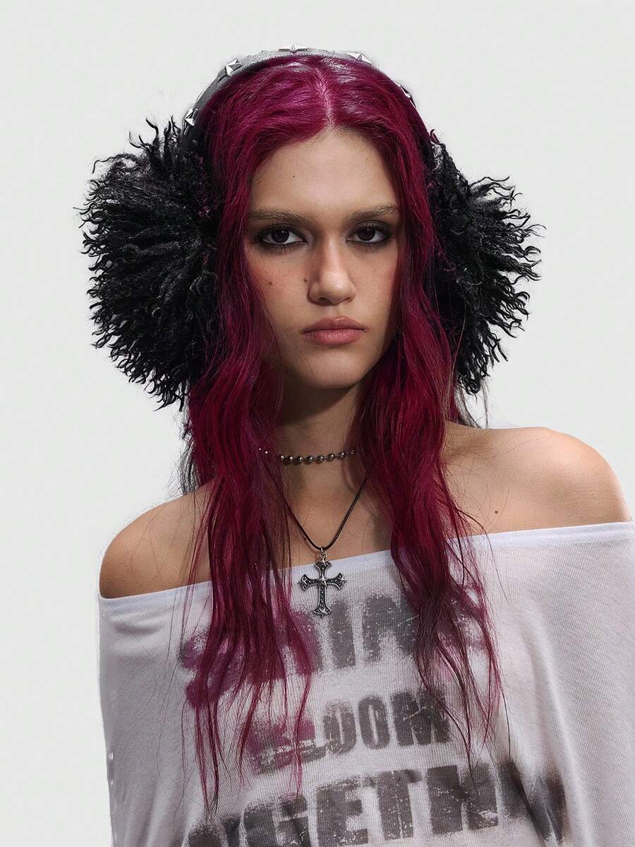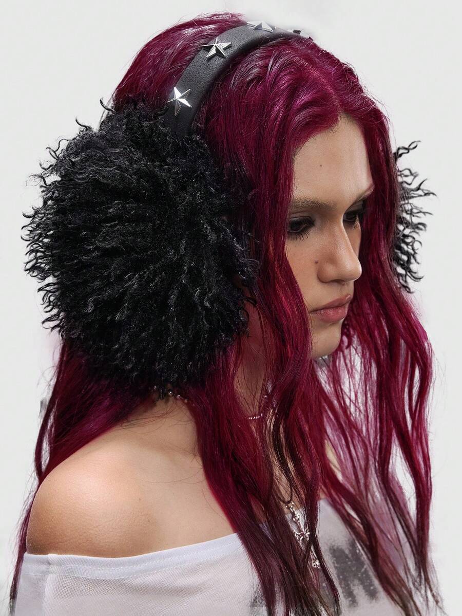 Grunge Punk 1 pieza Orejeras de peluche con estrellas de unicolor lindo, orejeras de piel sintética negra gruesa de estilo punk Y2K, orejeras plegables cálidas de invierno