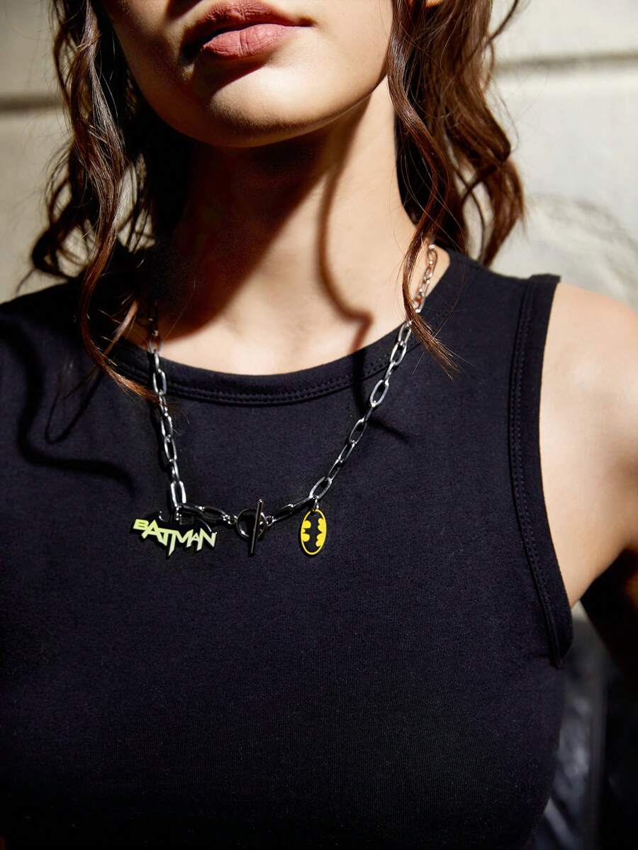 Batman X ROMWE 1 pieza Collar de cadena moda de acero inoxidable con letra murciélago adorno para mujeres para decoración diaria