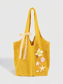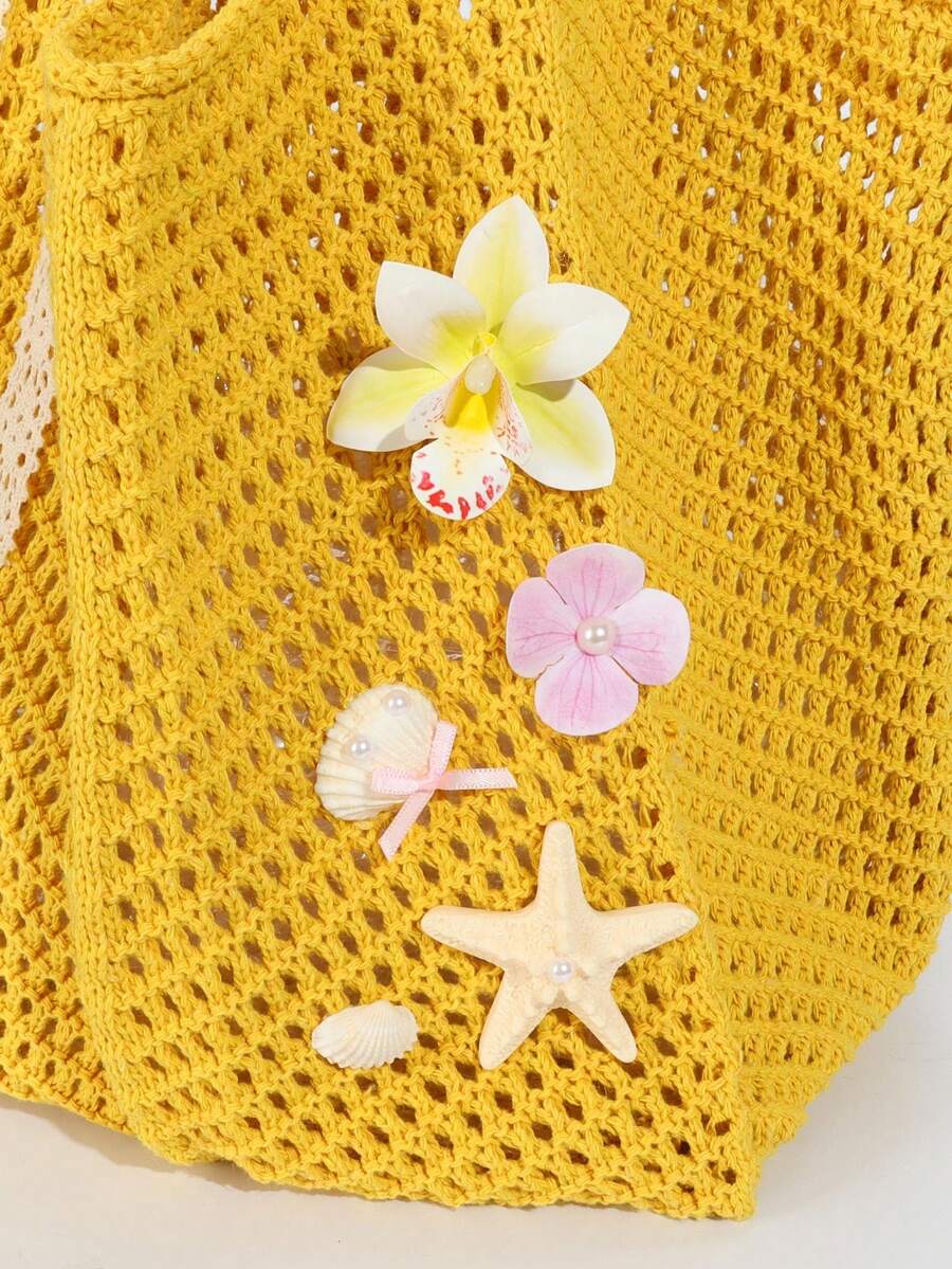Fairycore 1 pieza Bolso de hombro de mujer de gran capacidad con estilo de vacaciones en la playa tropical, con concha y estrella de mar recortadas, tejido amarillo