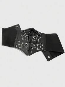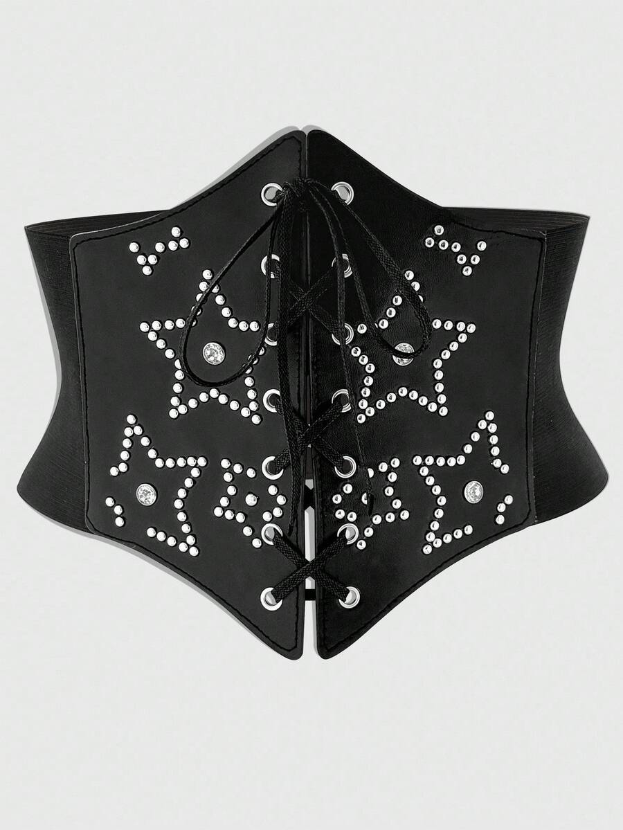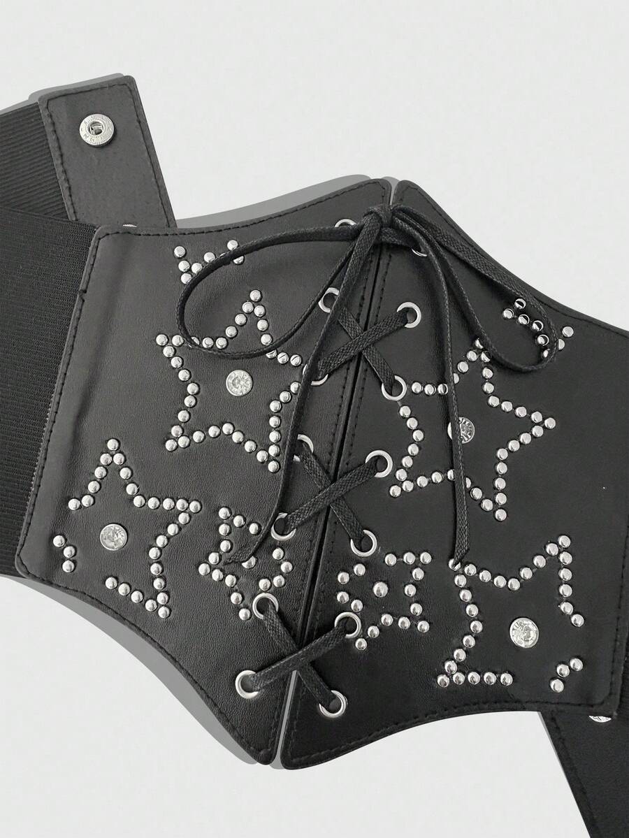 Goth 1 pieza Cinturón elástico de mujer con remaches negros y decoración de pentágono de rhinestone, estilo punk con hebilla hexagonal para la cintura, accesorio versátil para Halloween y uso diario