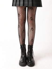 1 pieza Mujeres sexy leggings negros con patrón de calaveras, Medias de rejilla punk huecas, media panty para uso diario