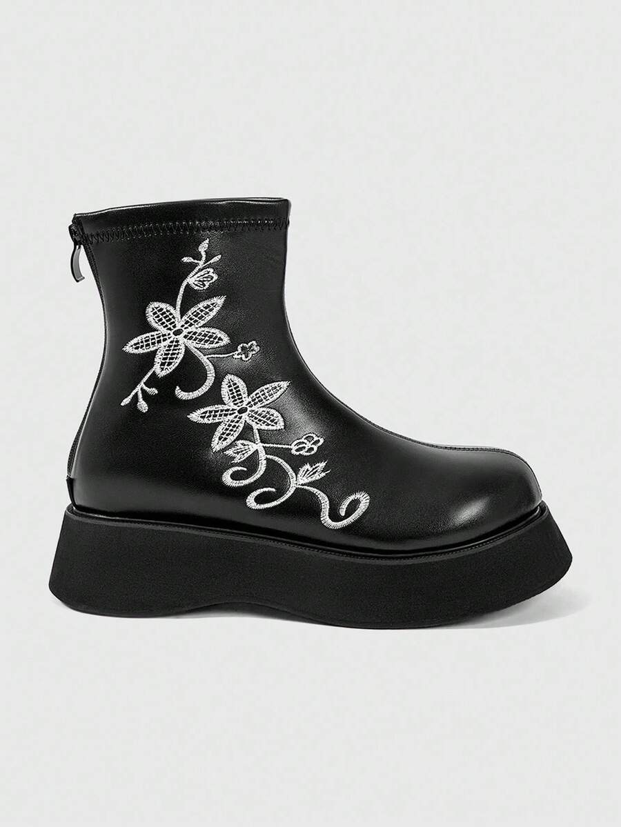 Grunge Punk Botas de tobillo con bordado floral punk de 2.0 pulgadas de tacón, botas cortas de suela gruesa casual para uso diario y al aire libre para mujeres