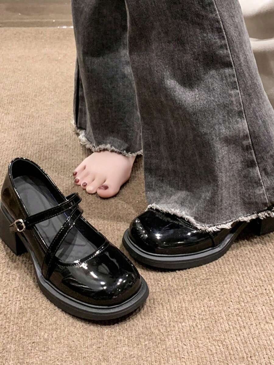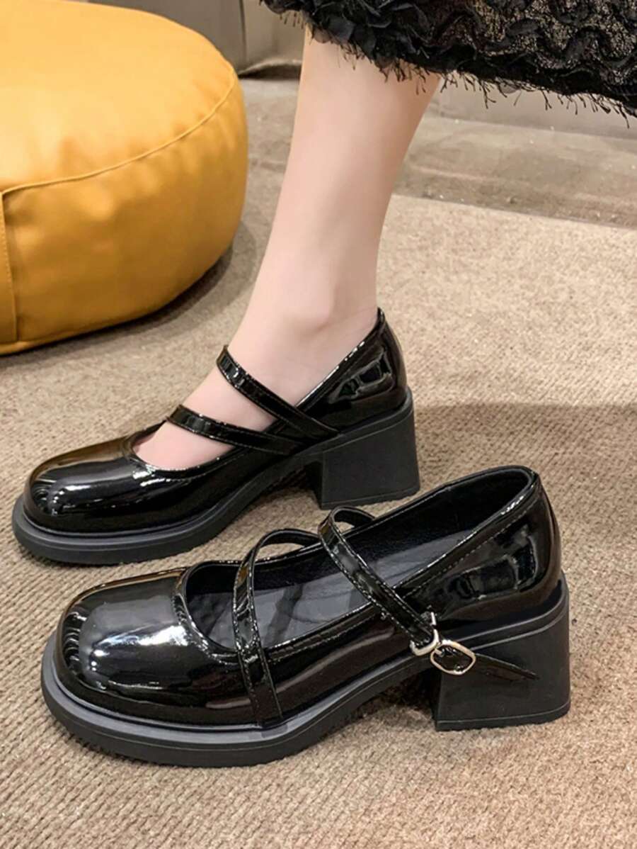 Goth Zapatos de tacón medio tipo Mary Jane con punta cuadrada y estilo francés para mujeres, con correa de hebilla en el tobillo, bajo corte y tacón grueso, modelo nuevo del 2024