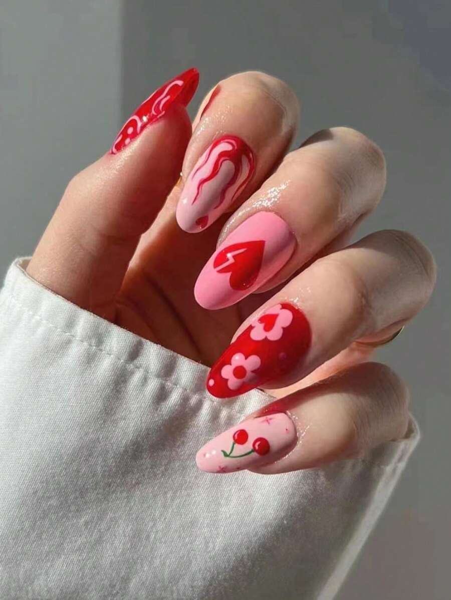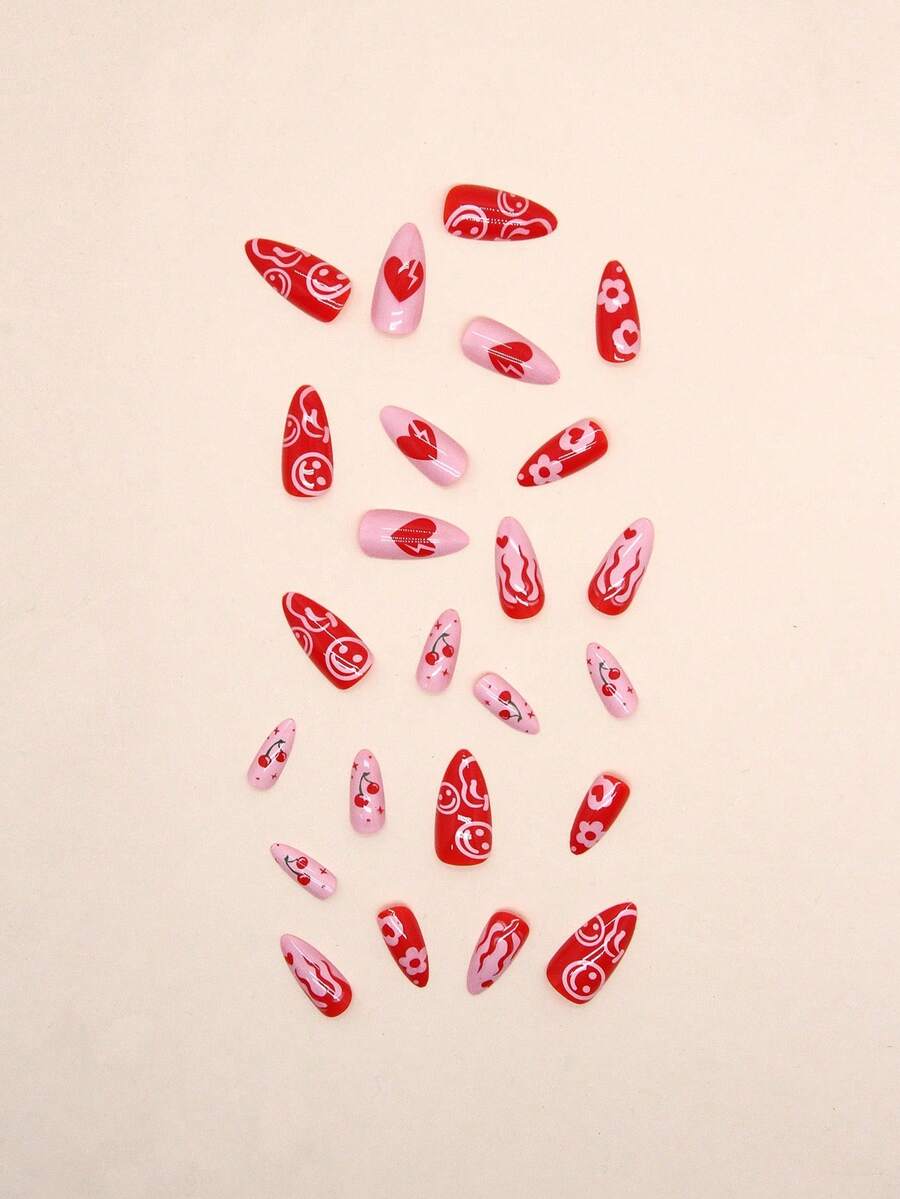 24 piezas Uñas postizas almendra uña en forma de con dibujos animados con corazón & grafiti arte con gel gelatina incluido