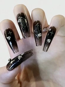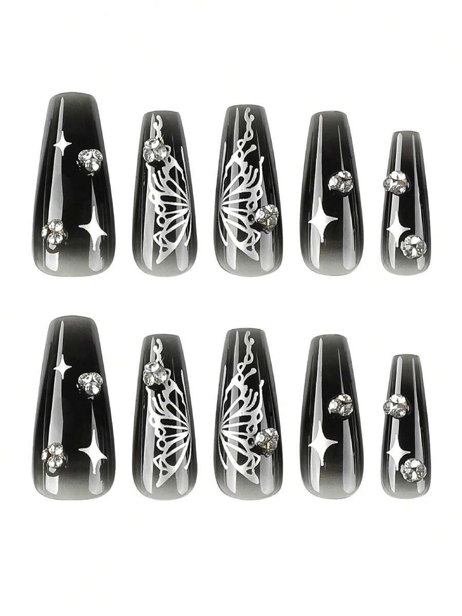 Goth 24 piezas claro como el hielo negro & plata ahuecado con mariposa & con estrella diamante de imitación uña ( incluido gelatina pegamento )