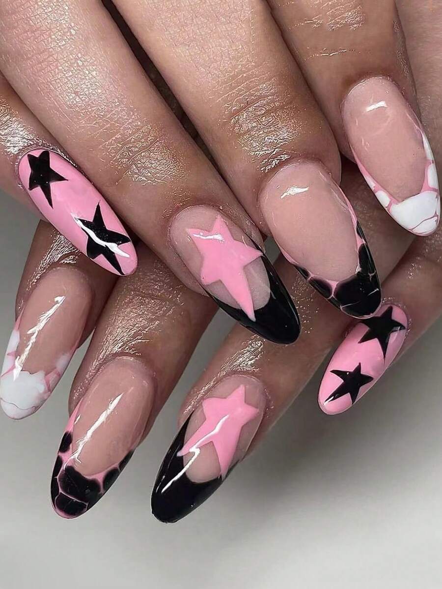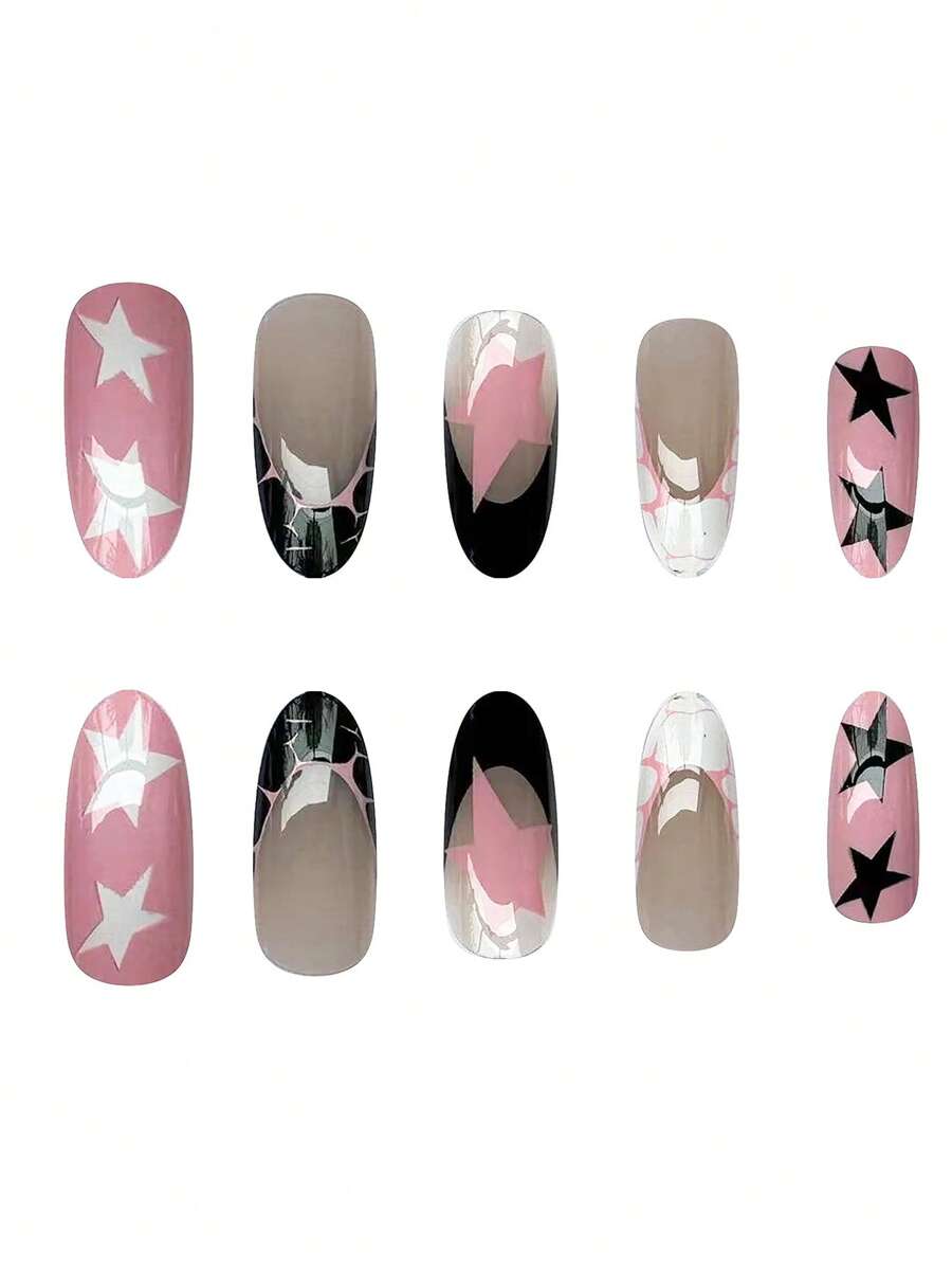 Grunge Punk 24 piezas largo almendra con patrón de estrella Uña postiza & 1 hoja cinta