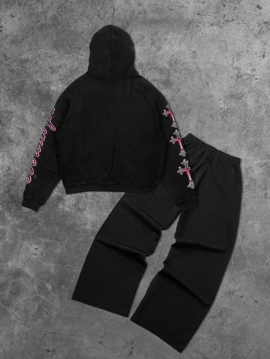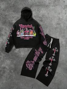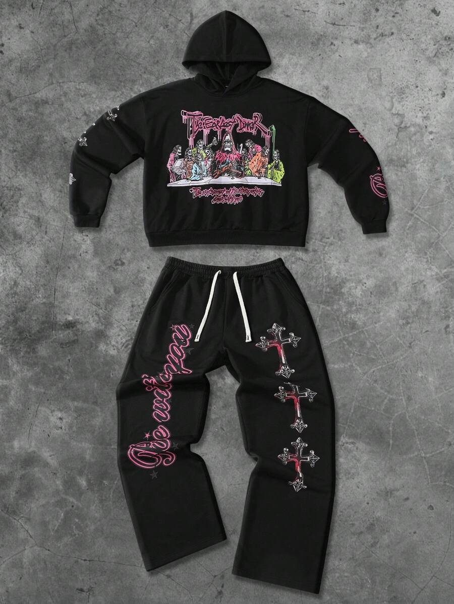 Street Life Set de 2 piezas de sudadera con capucha y pantalón de chándal con estampado gótico vintage para hombres, adecuado para otoño/invierno