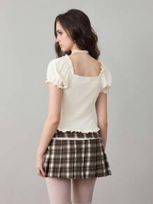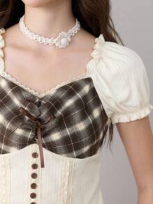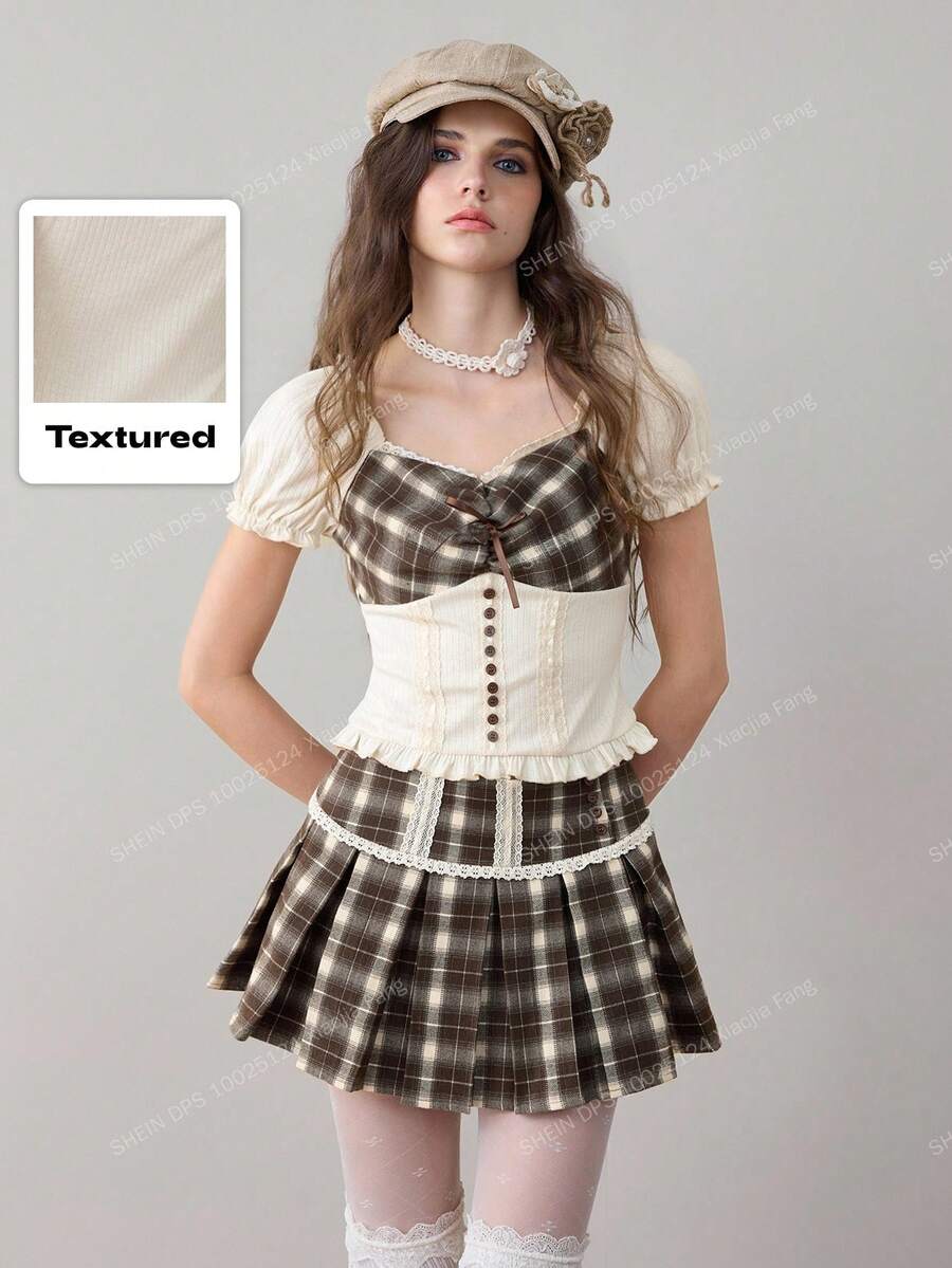 Set de camisa a cuadros y falda plisada para mujer, 2 piezas