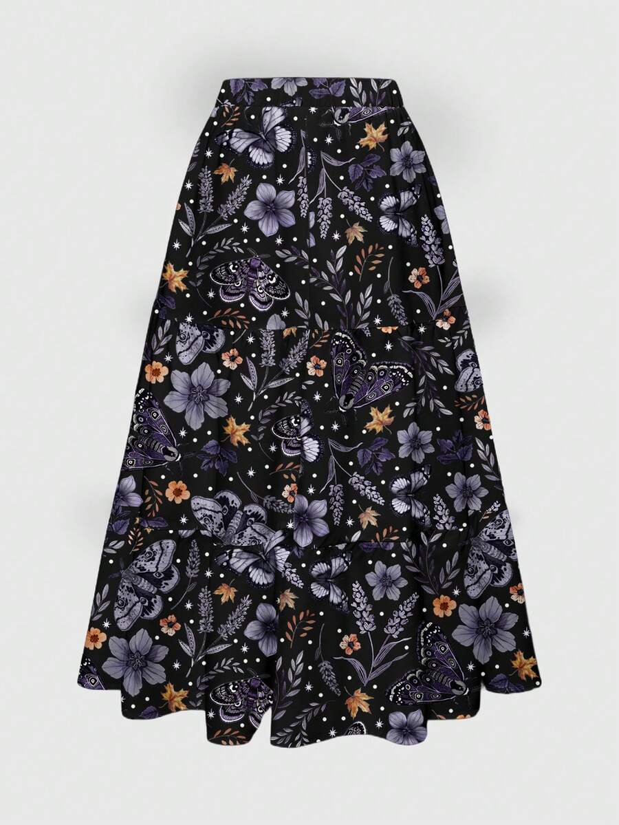Fairycore Falda bohemia con estampado todo sobre de flores, mariposas, sol y luna, de 3 capas, para otoño/invierno