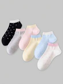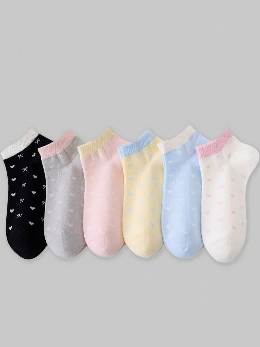 6 pares de calcetines cortos para mujer con diseños de corazones y moños, diseño minimalista, para primavera/verano, estilo universitario, de moda y versátiles