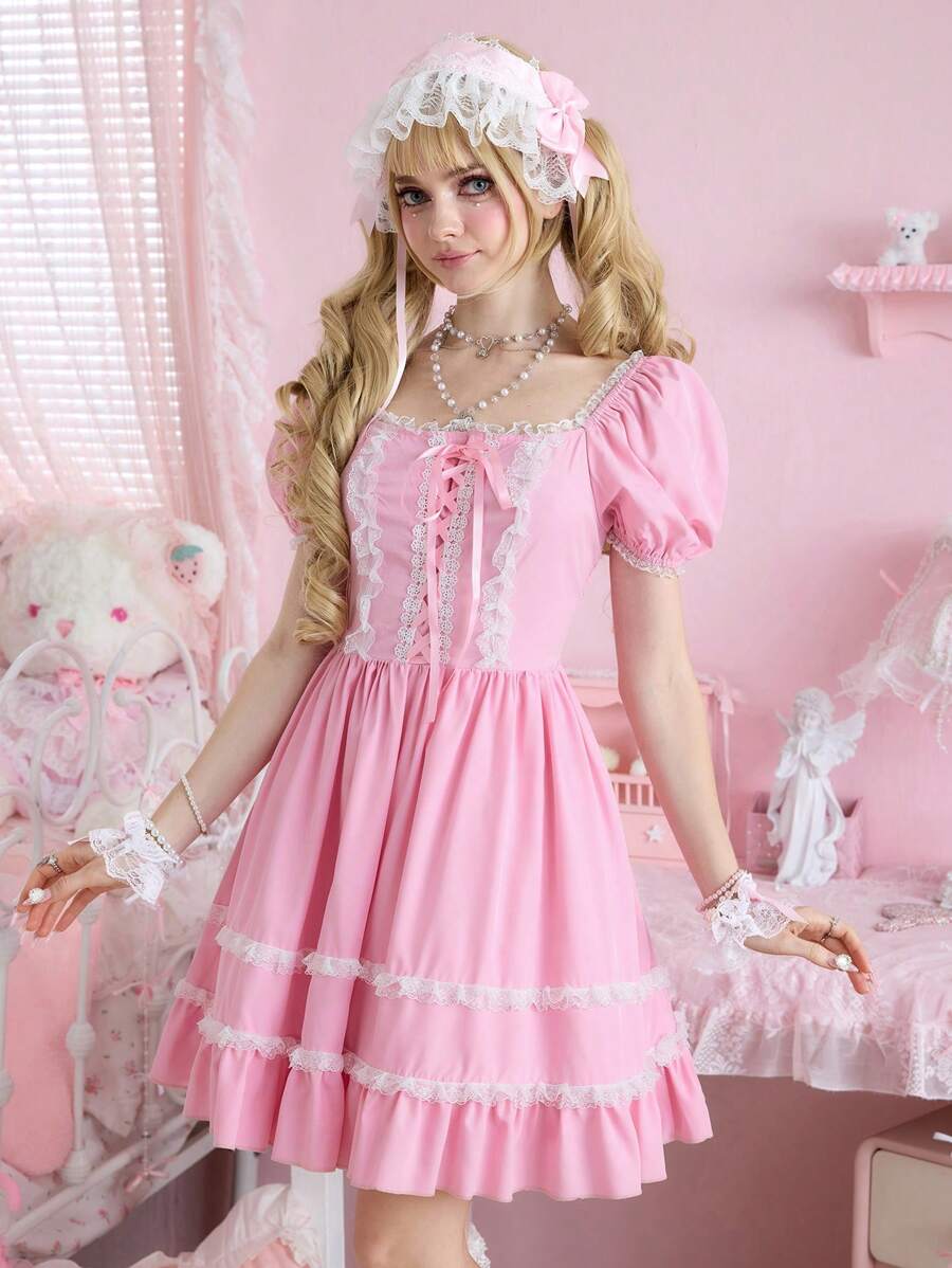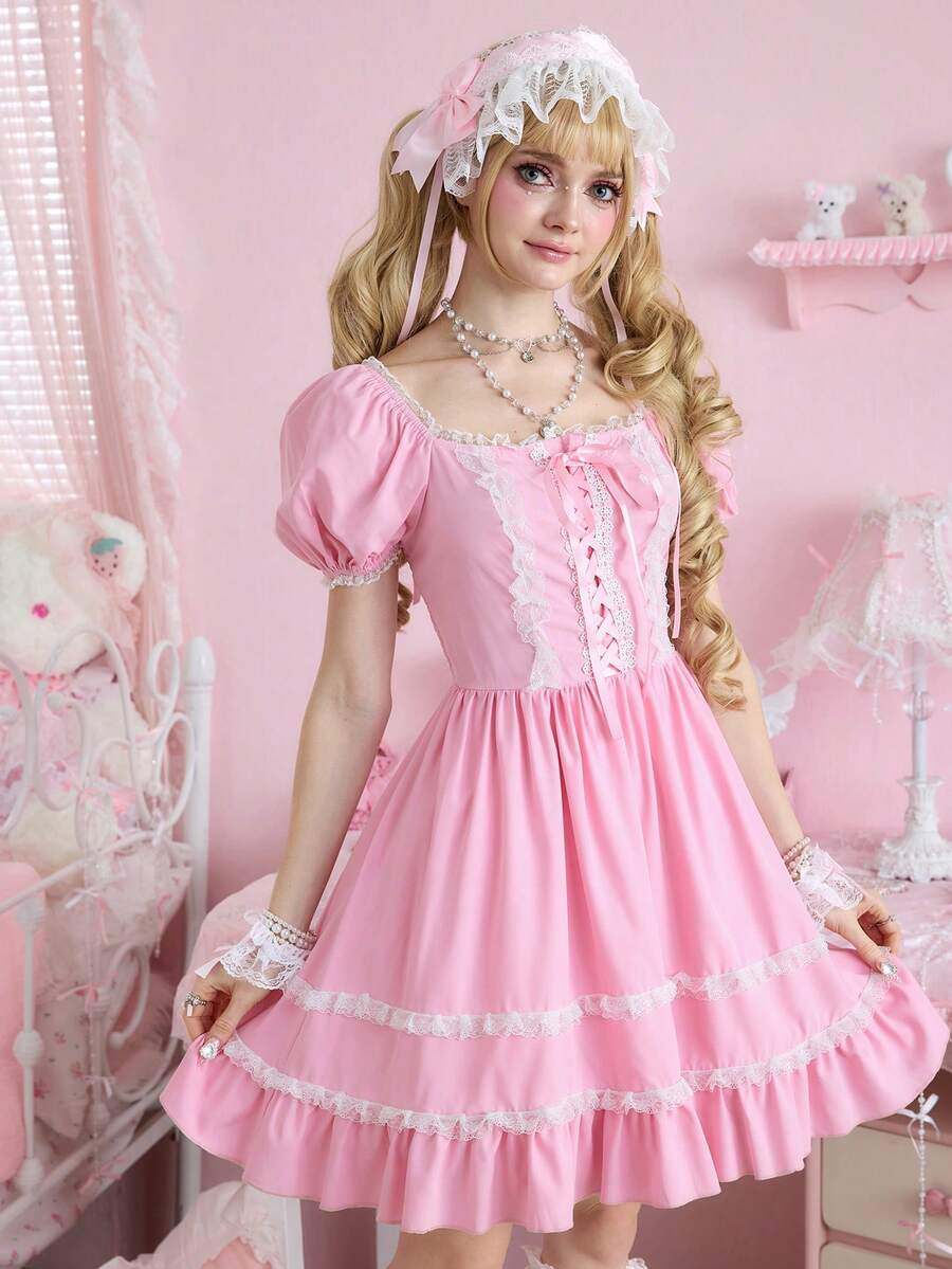 Academia Vestido de estilo Lolita elegante con decoración de lazo 3D y mangas abullonadas, vestido femenino dulce y lindo