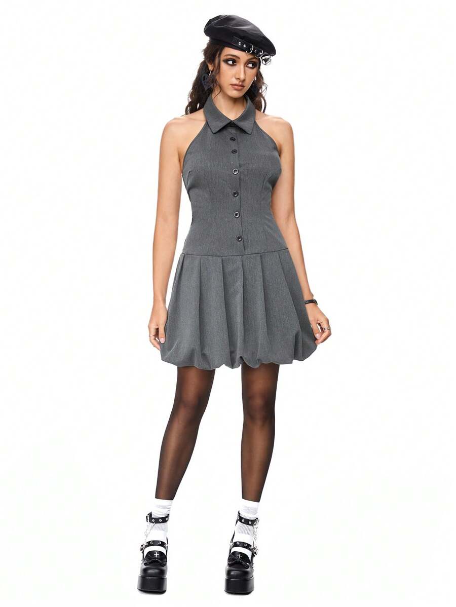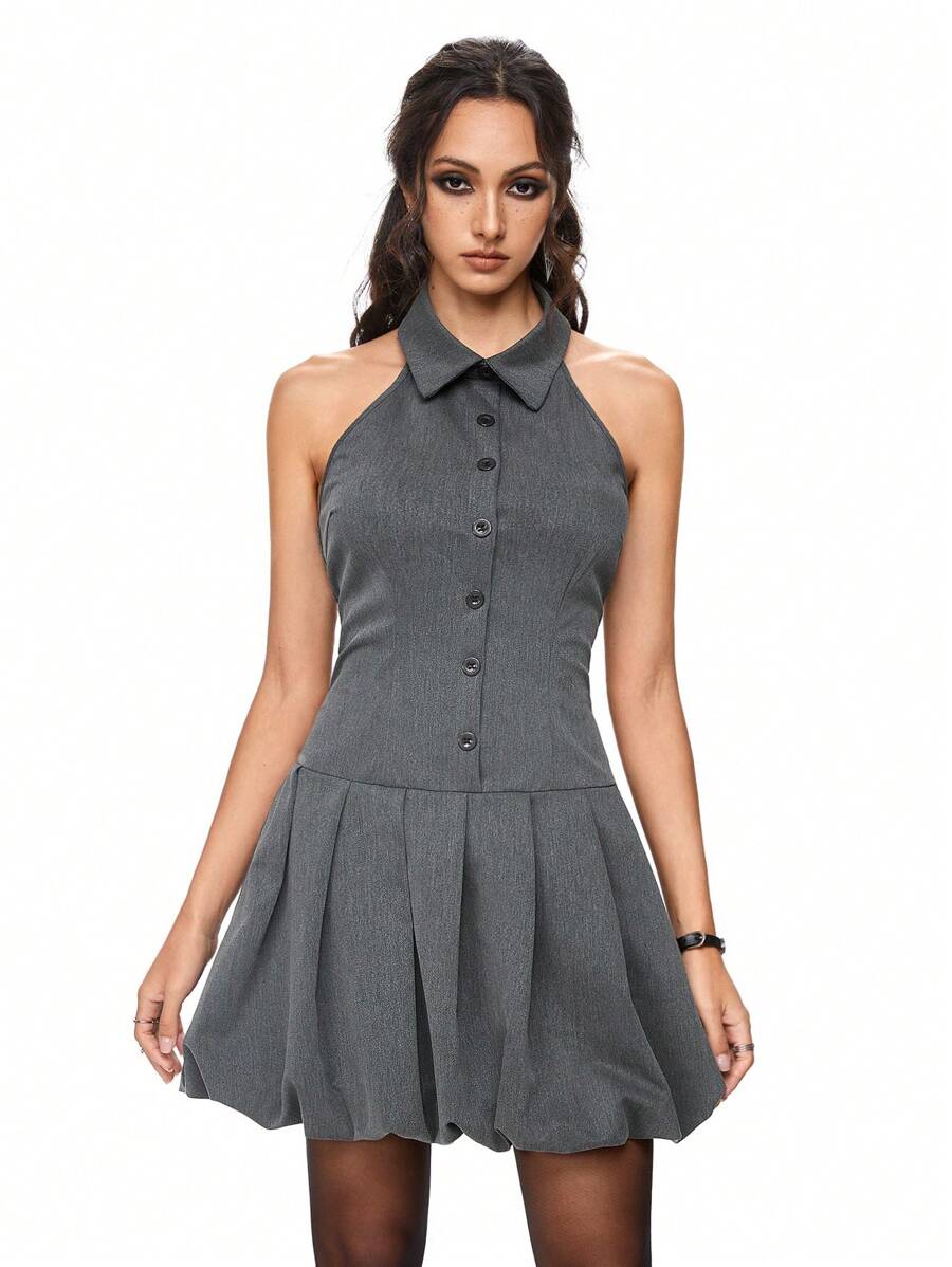 Vestido plisado con corte evasé, escote tipo camisa sin mangas, estilo academia de sirena de oficina, para mujer, para el colegio