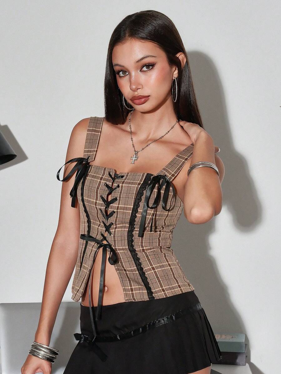 Academia Top de satén con tirantes de lazo y cuello cuadrado a cuadros retro para mujer
