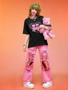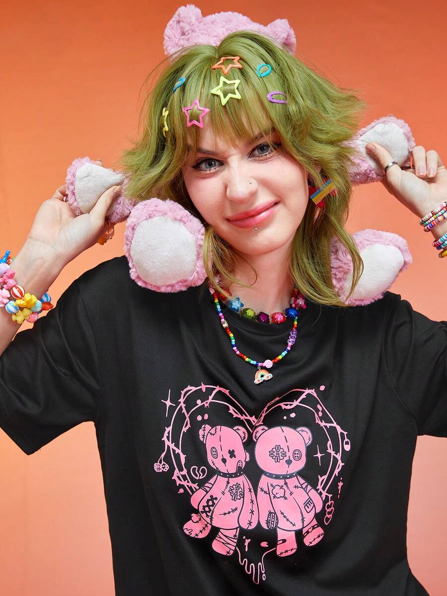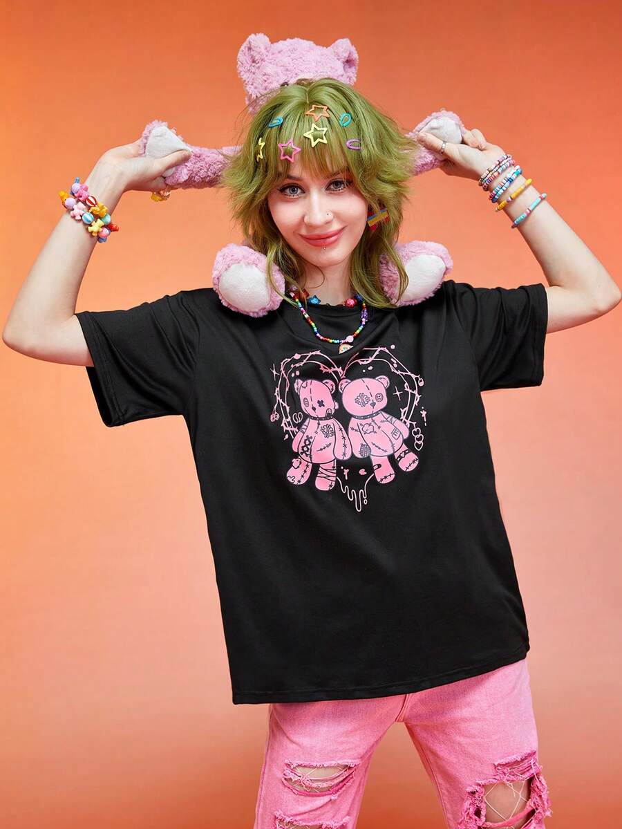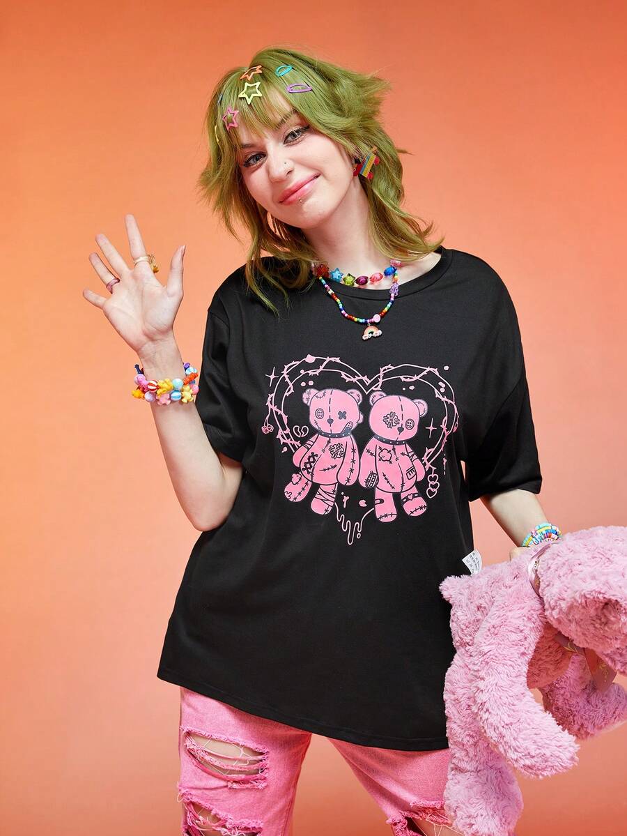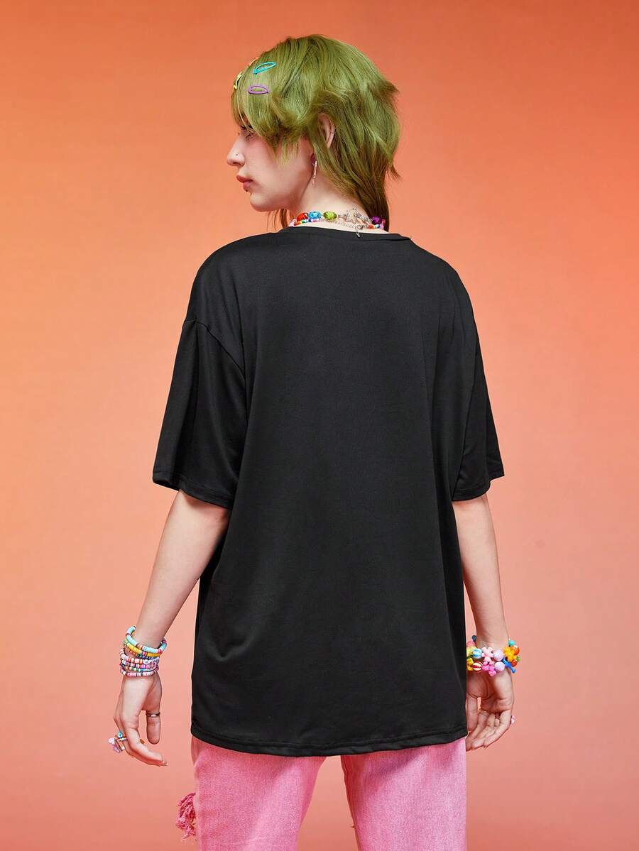 Anime Camiseta de hombros caídos con estampado de dibujos animados