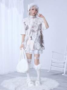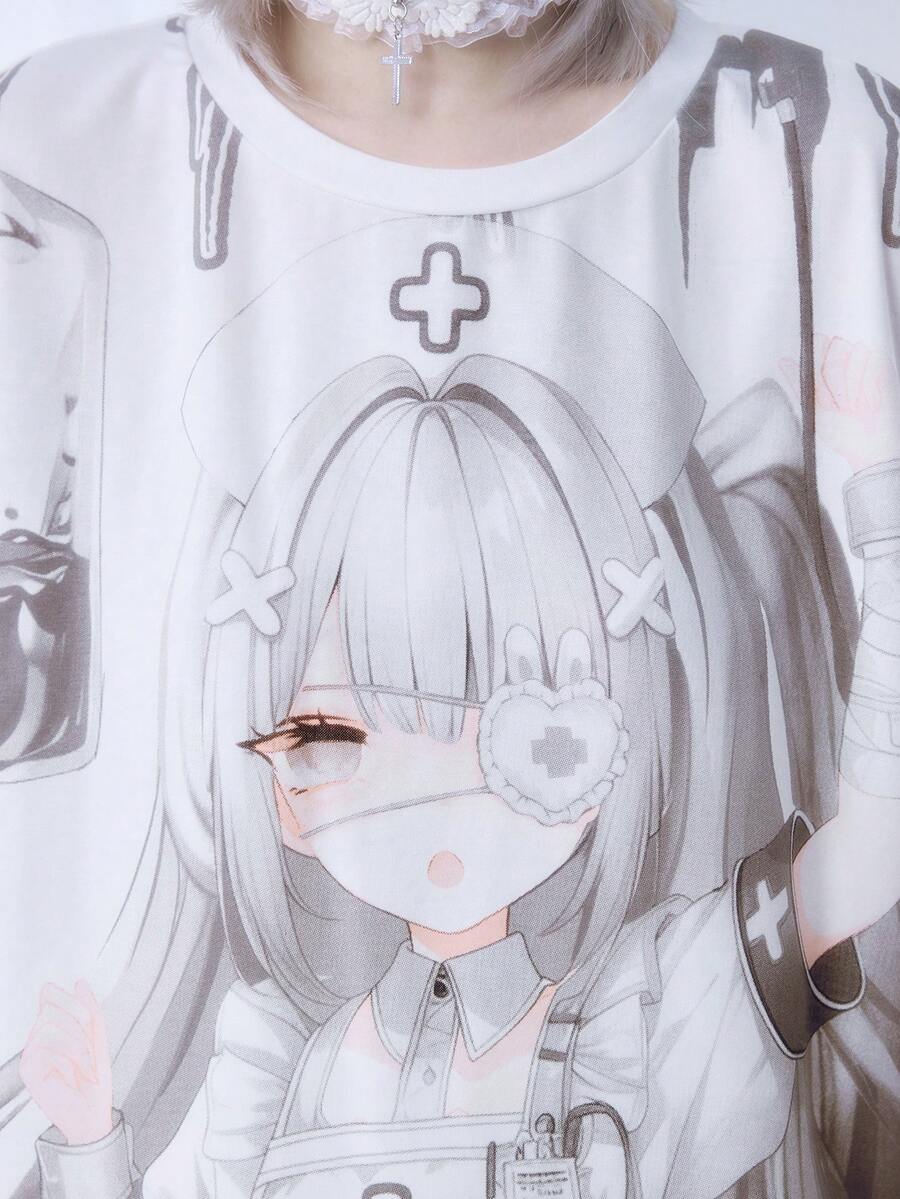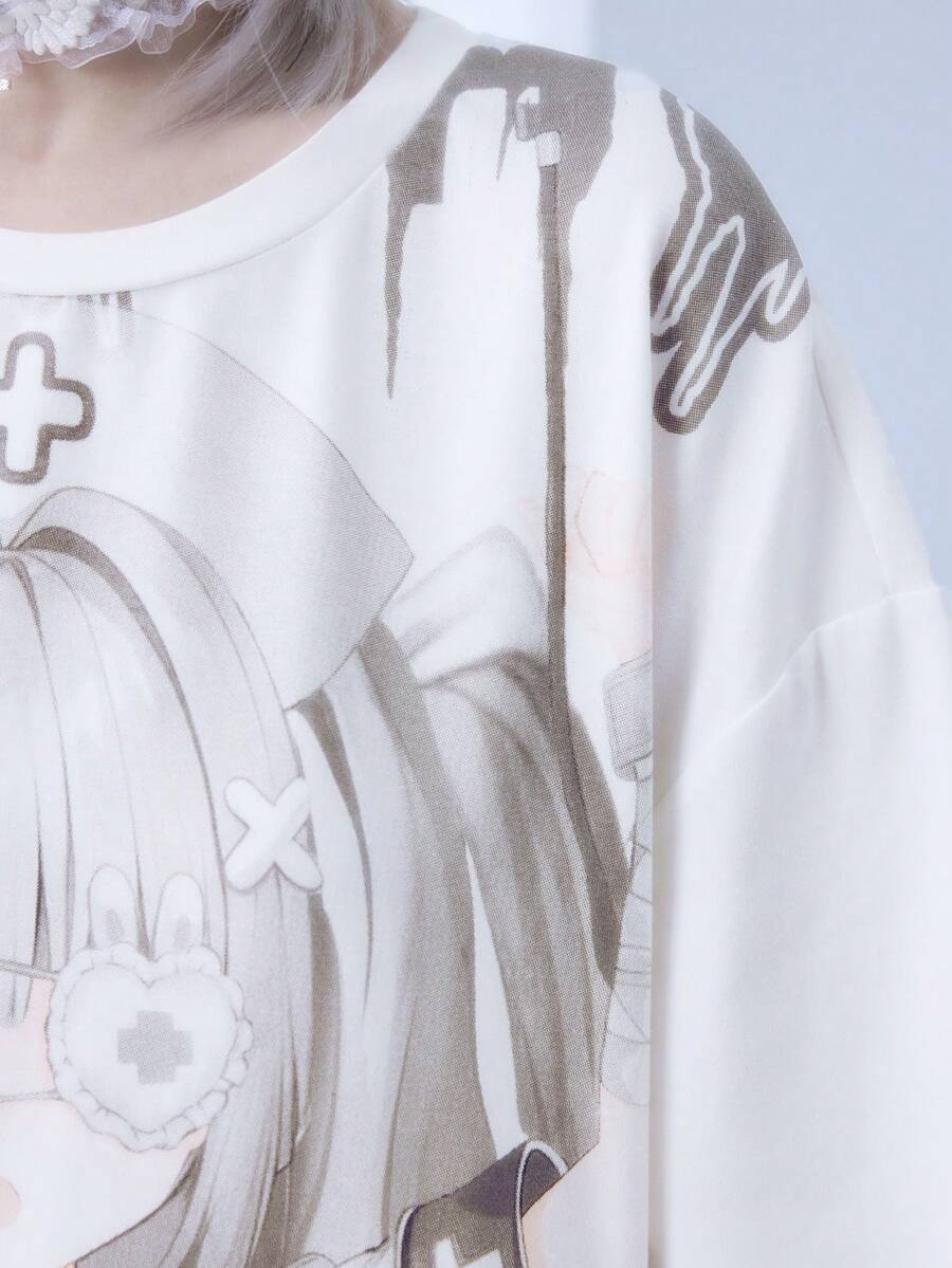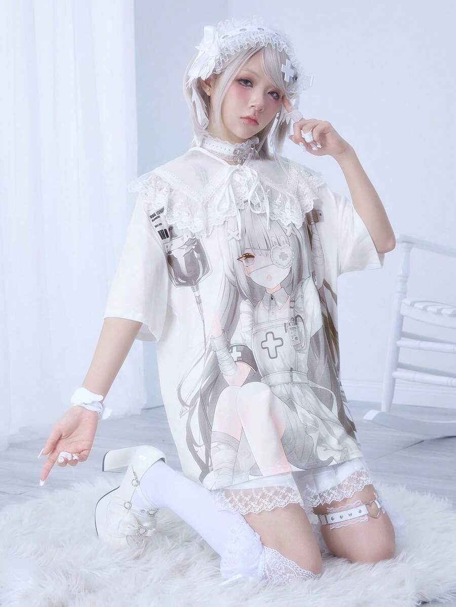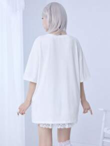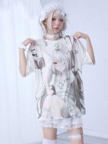 Camiseta de manga corta de cuello redondo holgada con estampado de chica anime yandere de color rosa