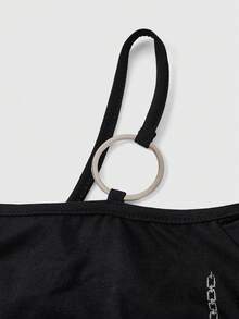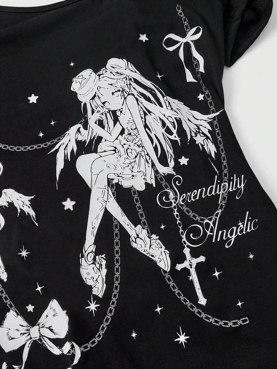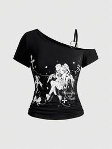 Camiseta de mujer de estilo oscuro de anime con hombro asimétrico, manga corta y elástica con pliegues