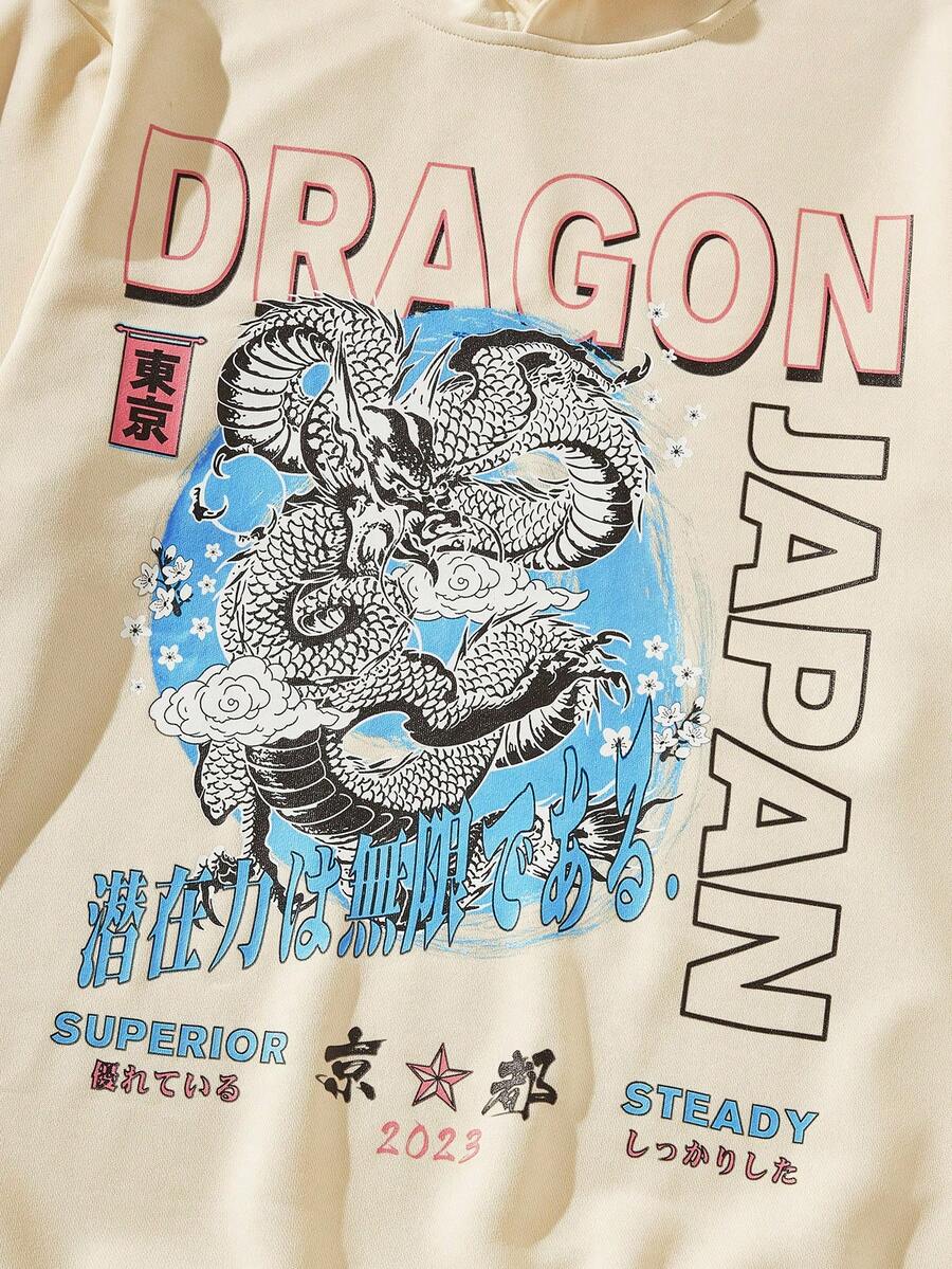 Anime Sudadera Con Capucha Para Hombres Con Estampado De Dragón Y Letras Y Cordón