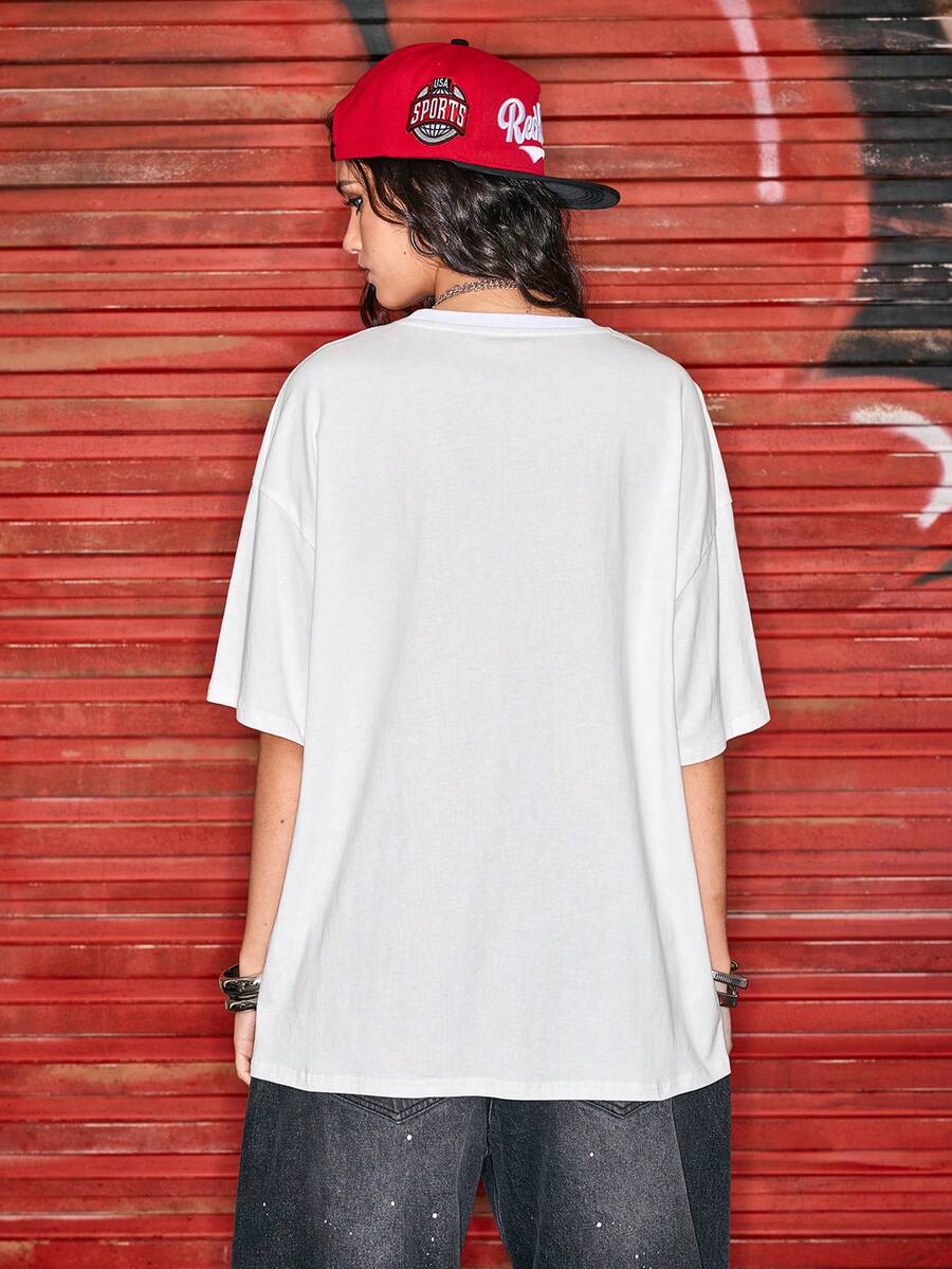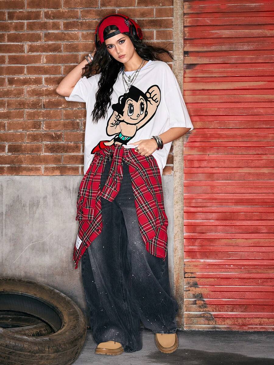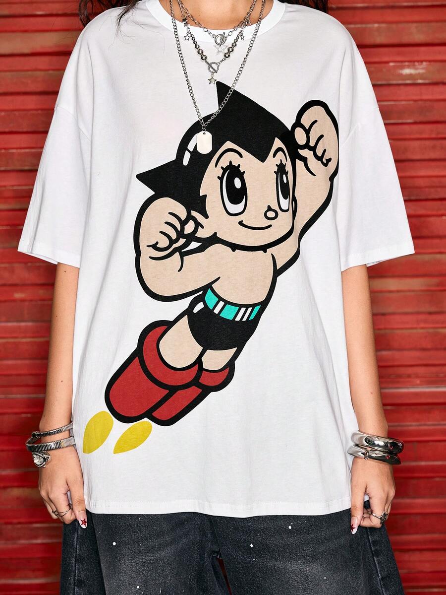 Astro Boy X ROMWE Camiseta de manga corta de cuello redondo con estampado gráfico de figura de dibujos animados, corte holgado, estilo casual de calle