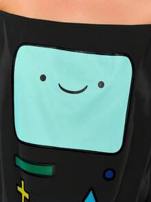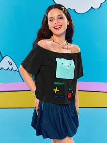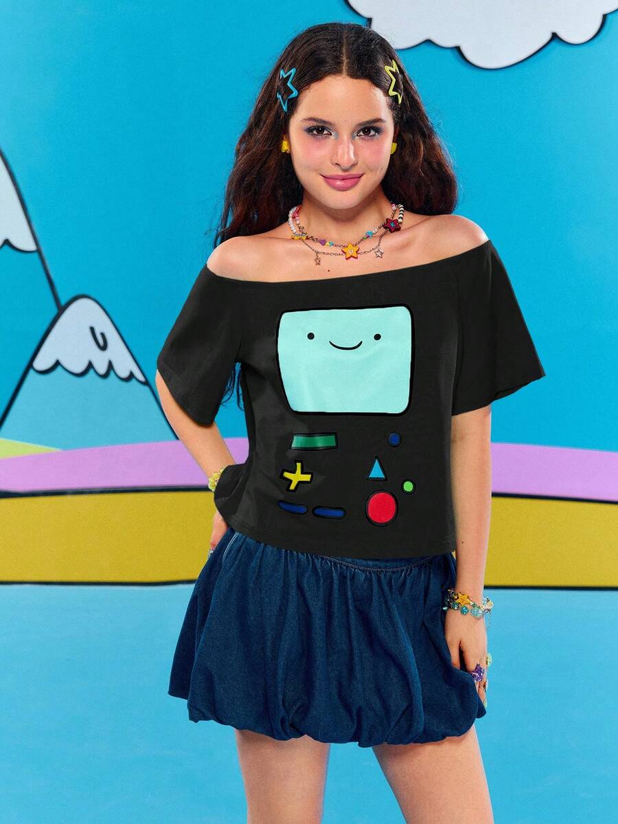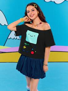 Adventure Time X ROMWE Camiseta gráfica de hombro asimétrico con dibujos animados, negro