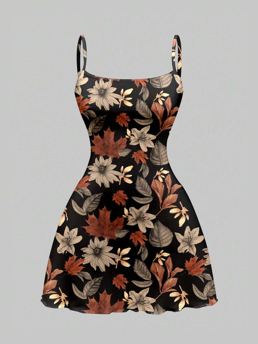 Fairycore Vestido corto con tirantes finos y escote bajo con estampado de hojas de otoño y flores para mujeres, otoño/invierno
