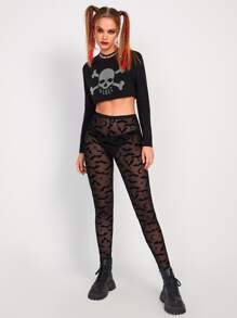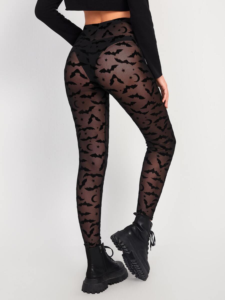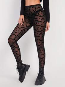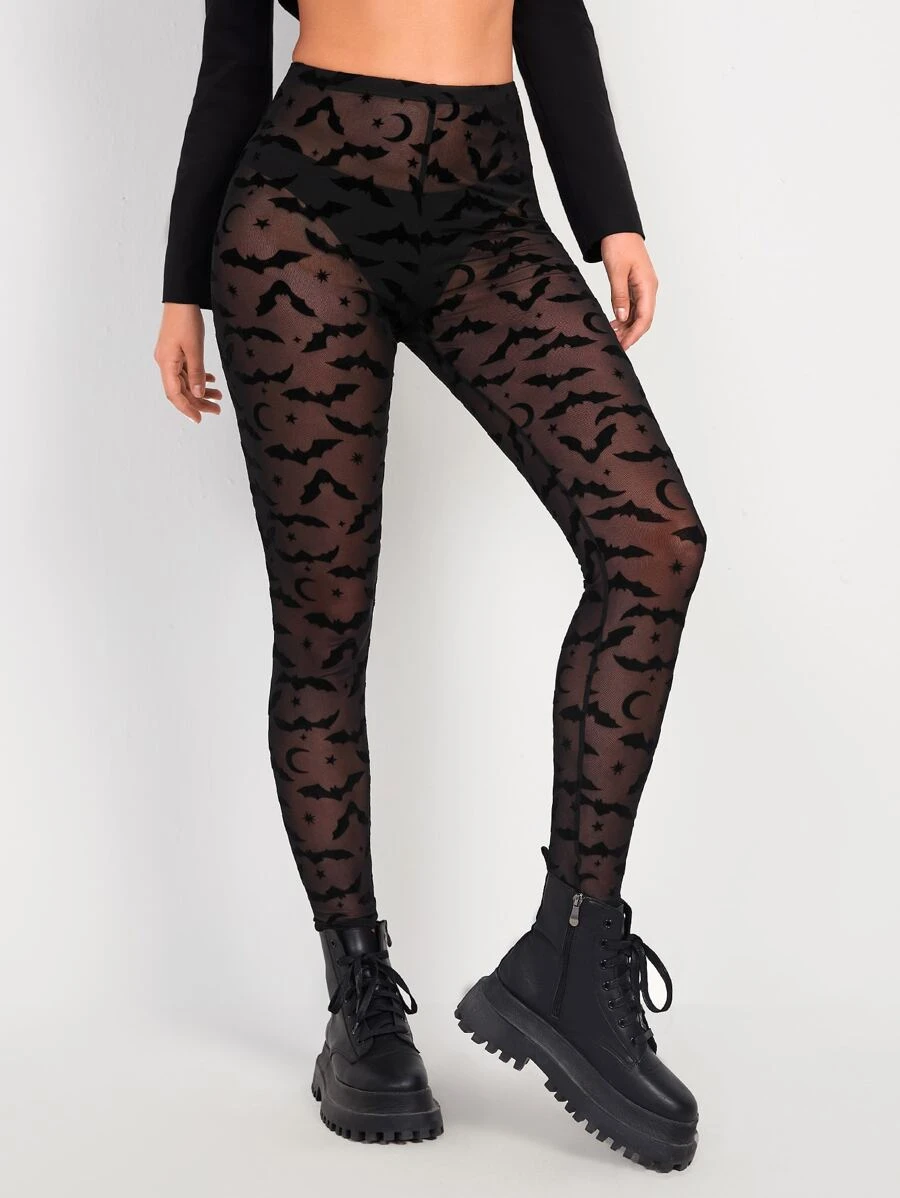 Leggings de malla semi transparente con estampado de murciélago sin tanga