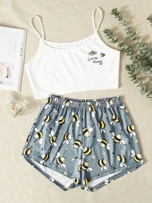 Conjunto de pijama cami con estampado de abeja con shorts