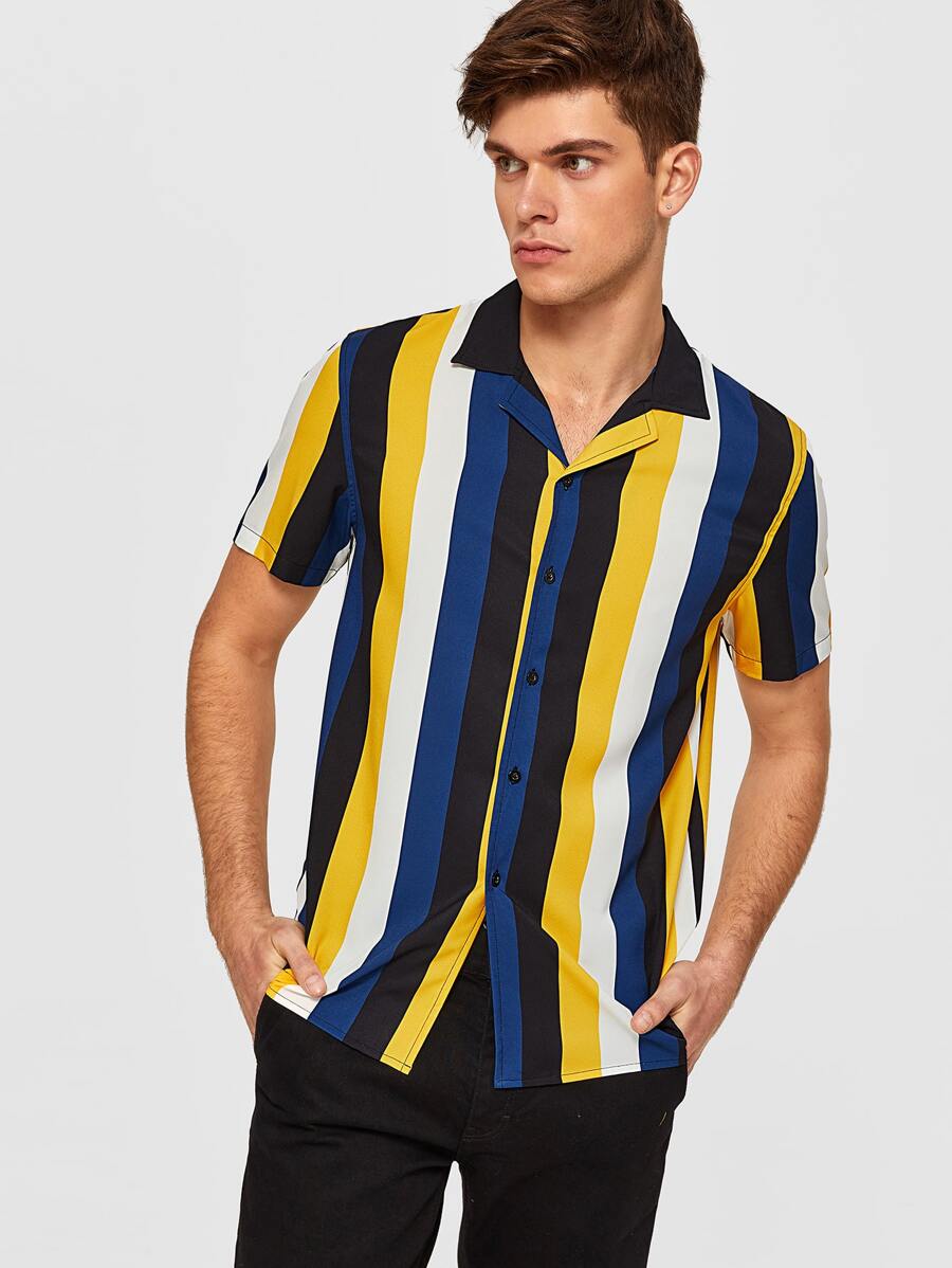 Camisa de hombres de rayas de color combinado de cuello revere