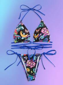Anime Conjunto de bikini de playa de verano con estampado de dibujos animados y diseño cruzado en el cuello con lazos laterales