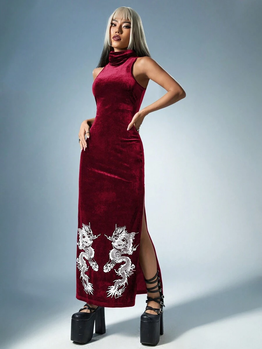 Vestido De Cuello Alto Con Patrón De Dragón Chino Y Dobladillo De Abertura Lateral