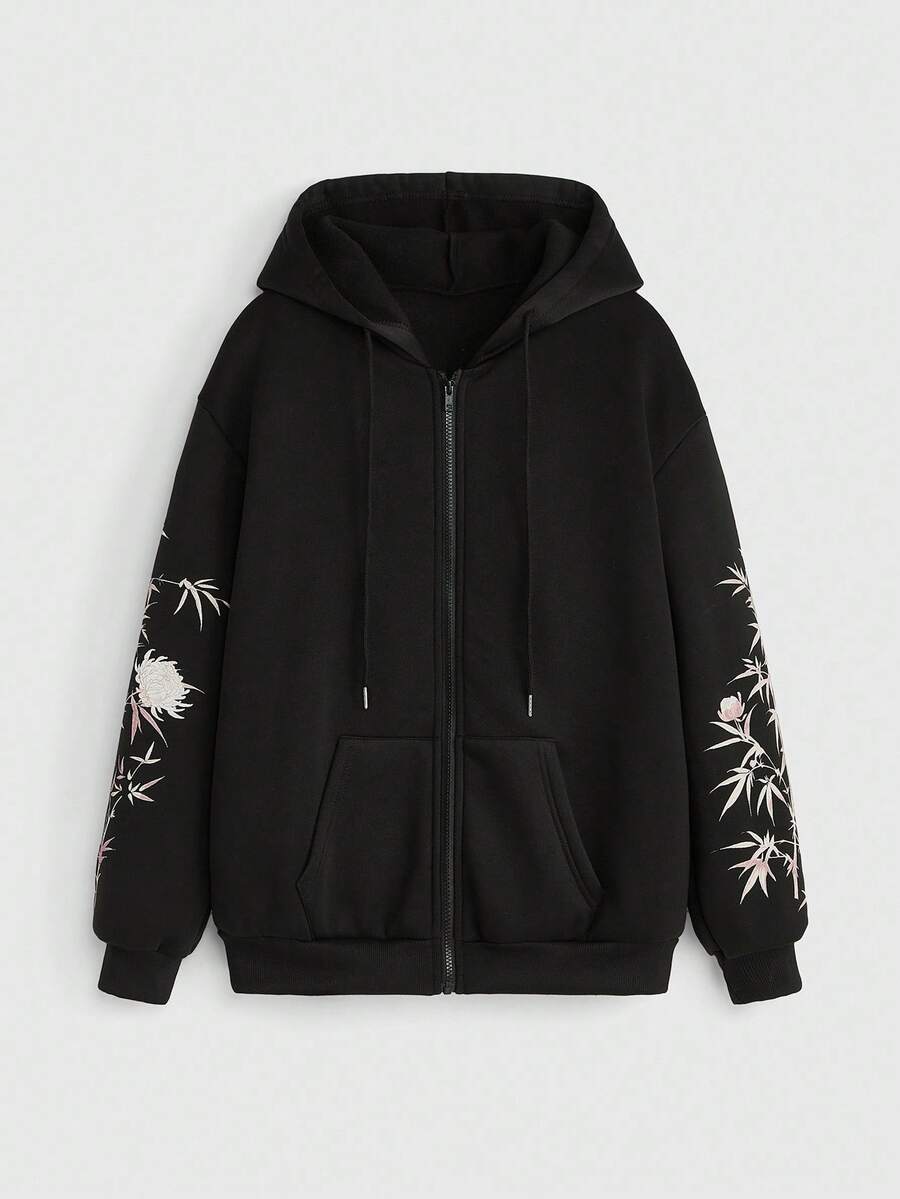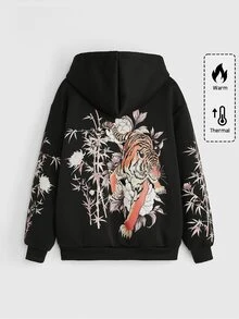 ROMWE Avant Sudadera con capucha con cremallera y cordón, estilo callejero de manga larga con bordado de estilo chino de tigre, flores y bambú