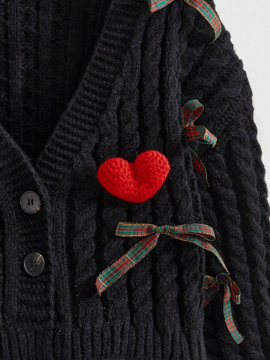 Kawaii Cárdigan corto suelto de punto trenzado con decoración de lazo a cuadros rojos en forma de corazón 3D, color negro, para mujer, otoño/invierno