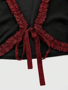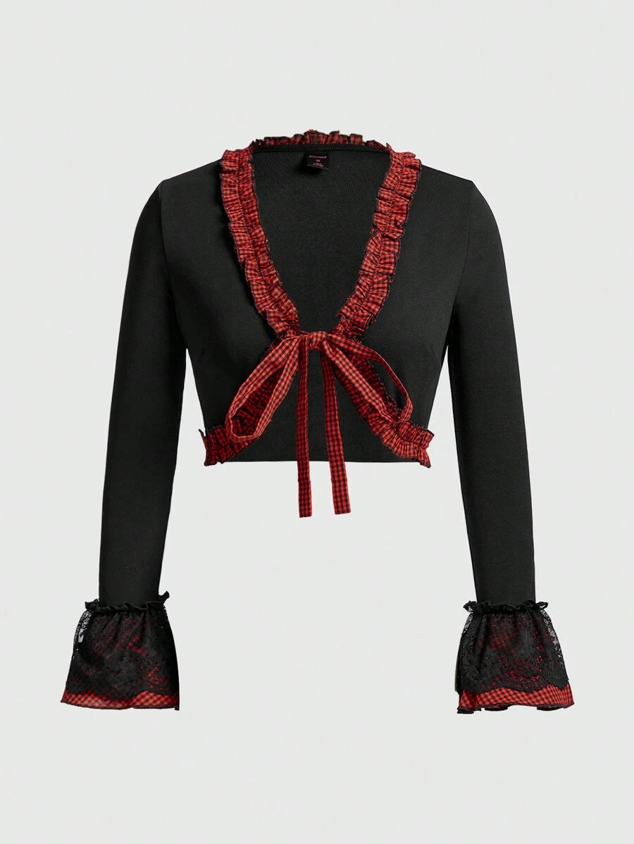 Top crop con encaje en contraste con cordón delantero de manga amplia