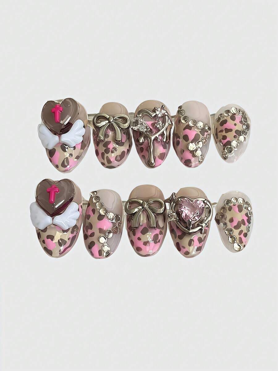 Kawaii Piezas de uñas postizas hechas a mano con estilo de bailarina, alas blancas, moño y estampado romántico de corazón con camuflaje y estampado de leopardo, decoración de uñas enérgica para niñas, adecuada para salidas diarias y citas