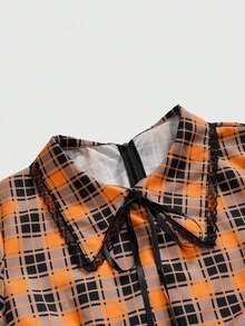 ROMWE Avant Vestido mini de mujer con parches de encaje a cuadros oscuros de Halloween y decoración de lazo