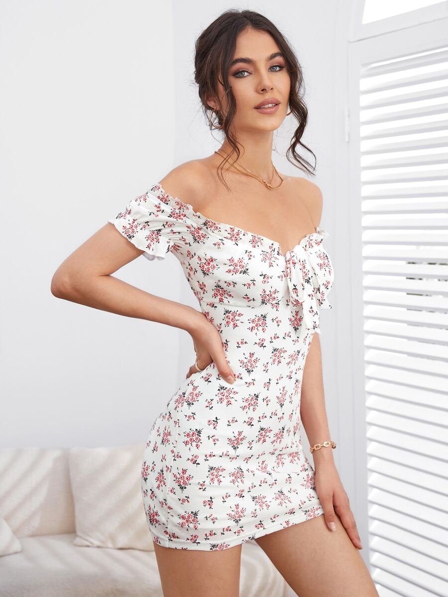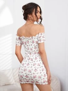 Vestido ajustado floral de hombros descubiertos ribete con fruncido