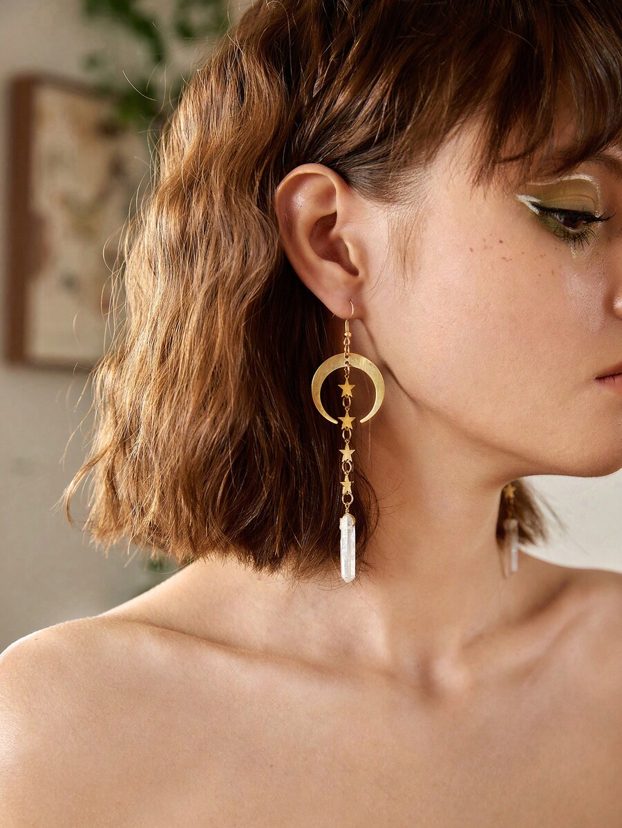 Fairycore 1 par Pendientes largos moda hierro de aleación con diseño de luna y estrella para mujeres para decoración diaria