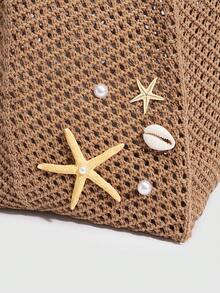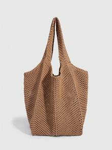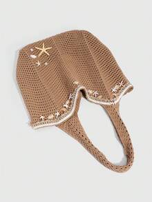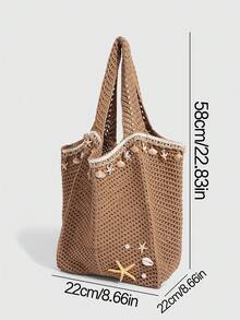 Fairycore 1 pieza Bolso de hombro de mujer de estilo resort de playa tropical, tejido hueco en color caqui, de gran capacidad