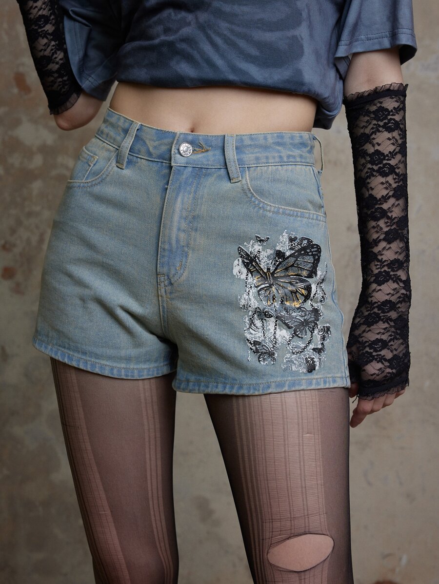 Fairycore Pantalones Cortos De Mezclilla Con Gráficos De Mariposas