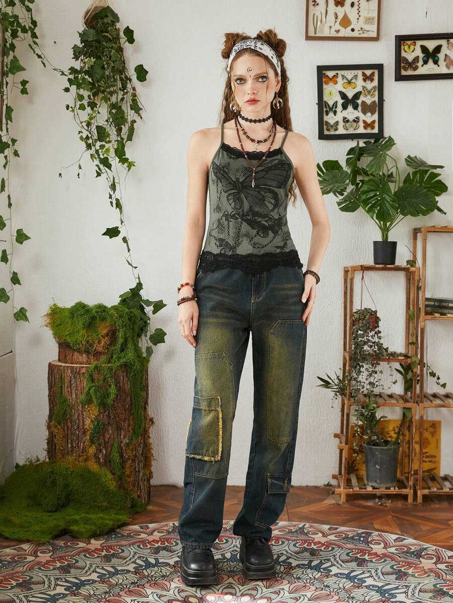 Fairycore Top de tirantes con estampado de mariposa con encaje en contraste