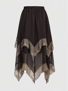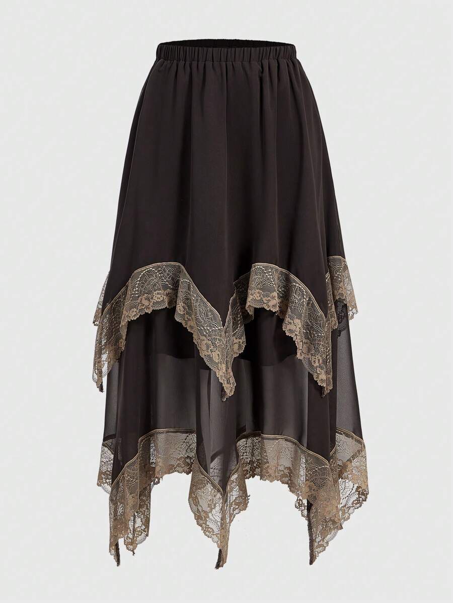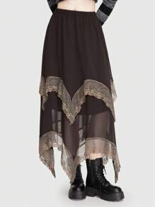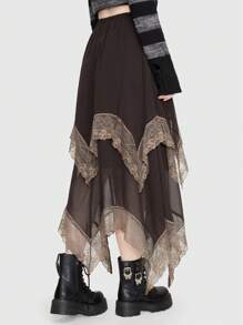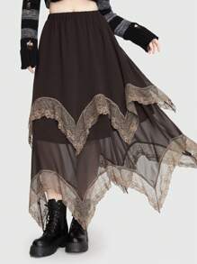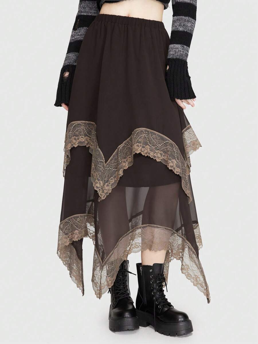 Fairycore Falda de cintura elástica con parches, encaje y dobladillo de malla