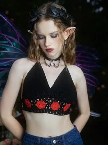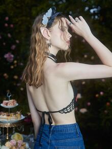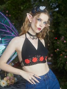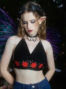 Fairycore Top de punto floral de croché de espalda abierta con cordón