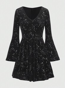 Fairycore Vestido De Terciopelo Con Mangas Con Volante Y Estampado De Galaxia