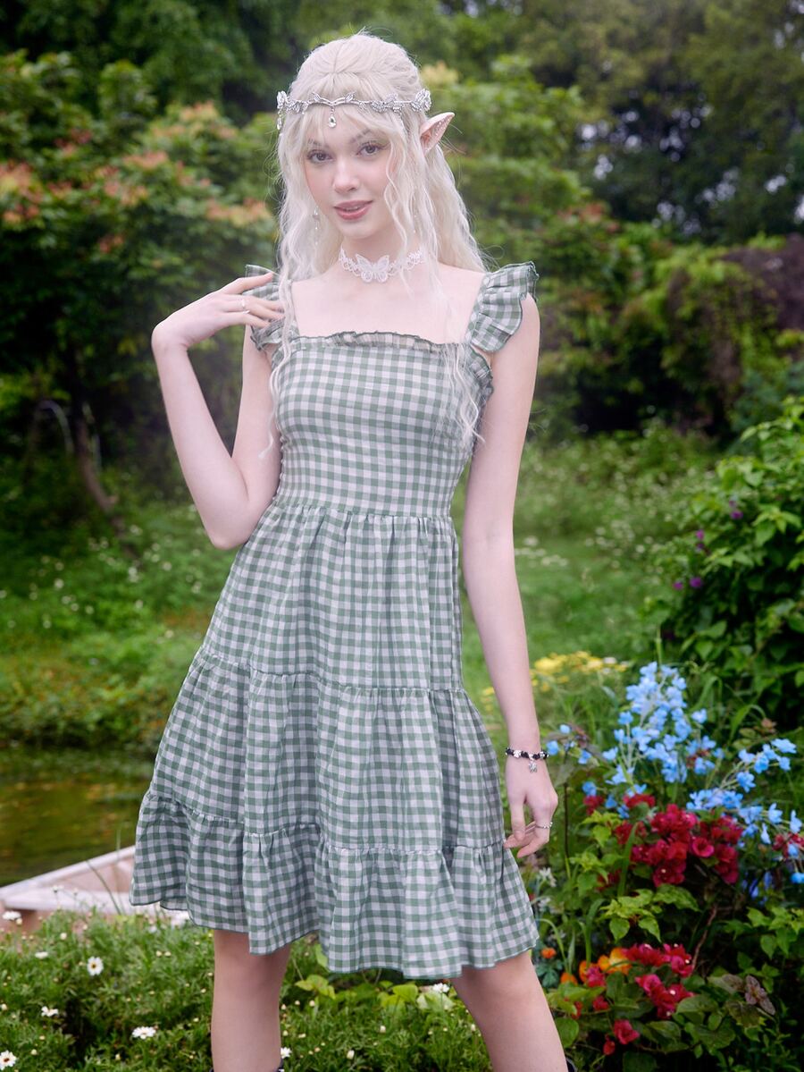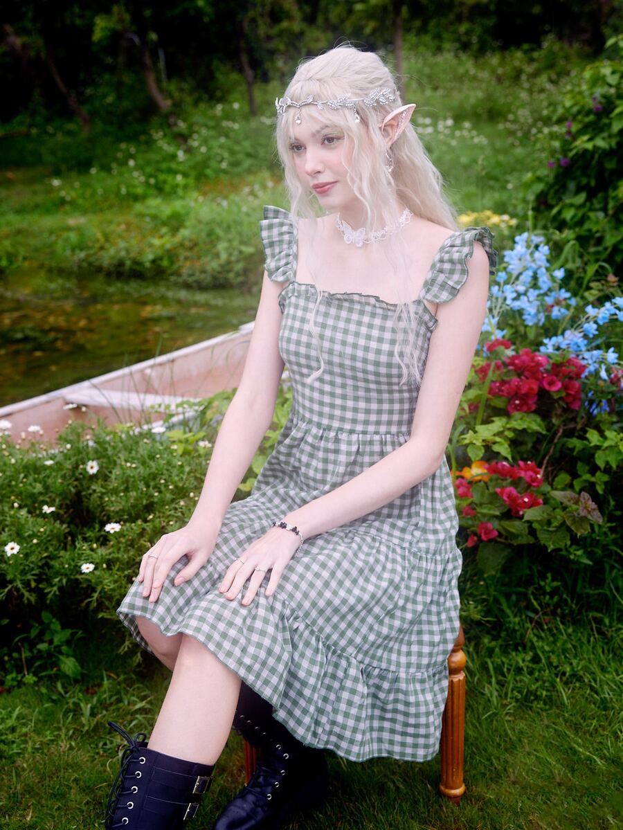 Fairycore Vestido de verano de guingán fruncido