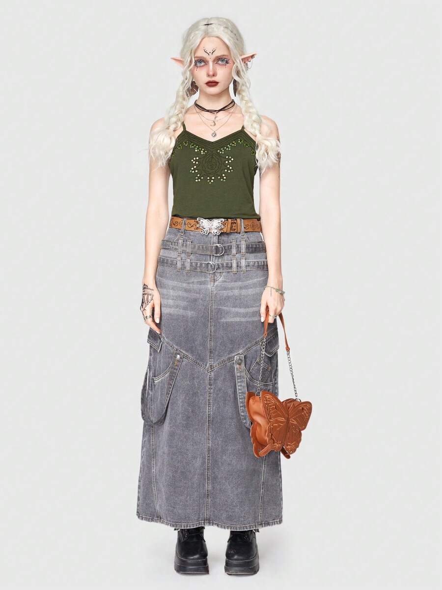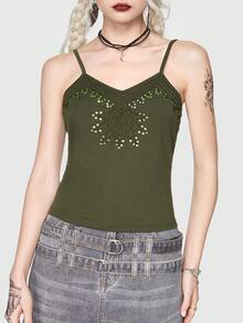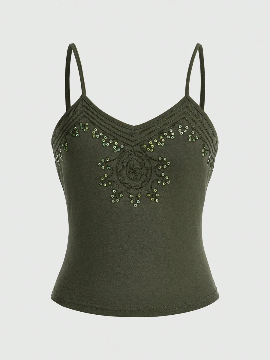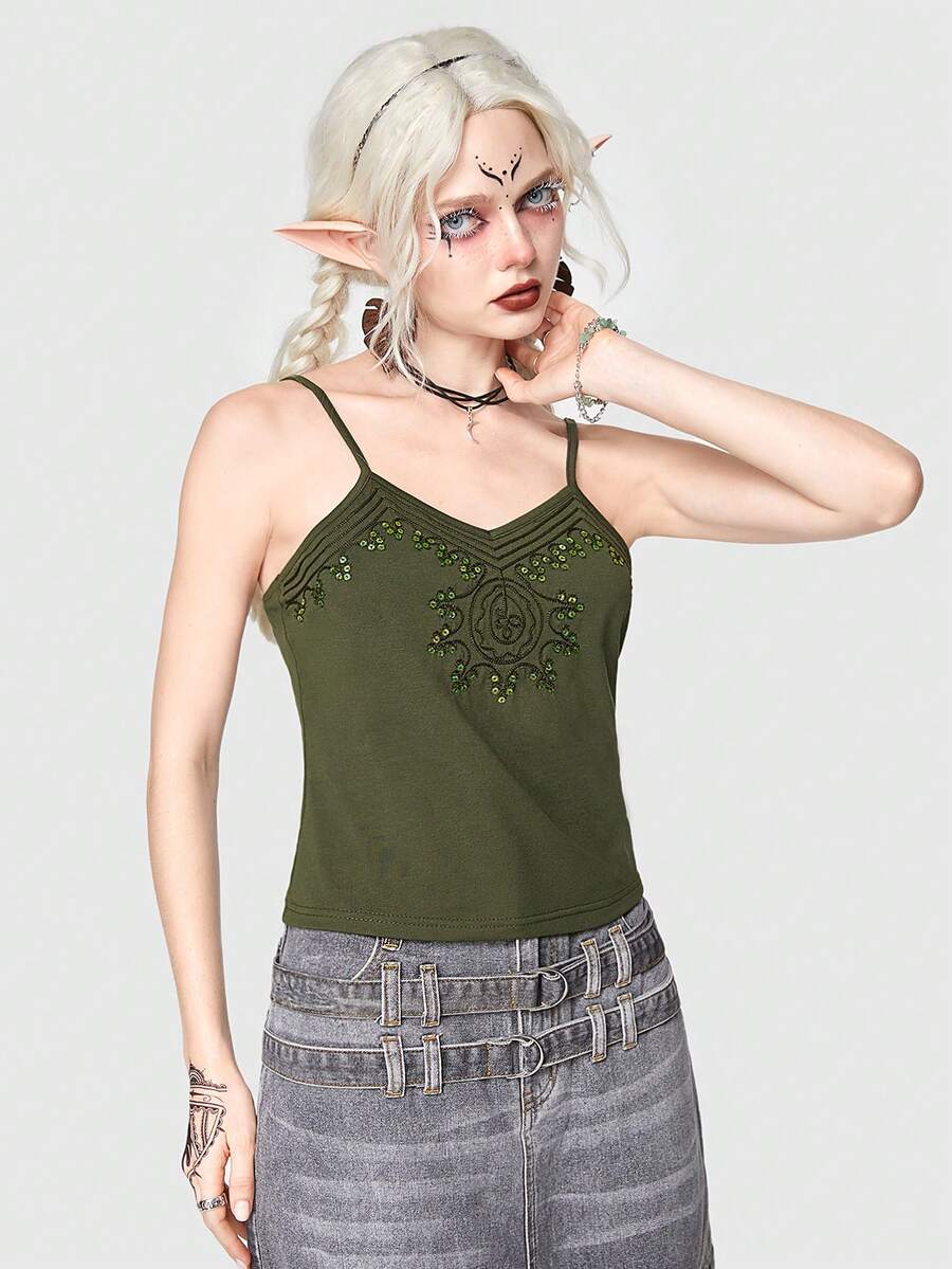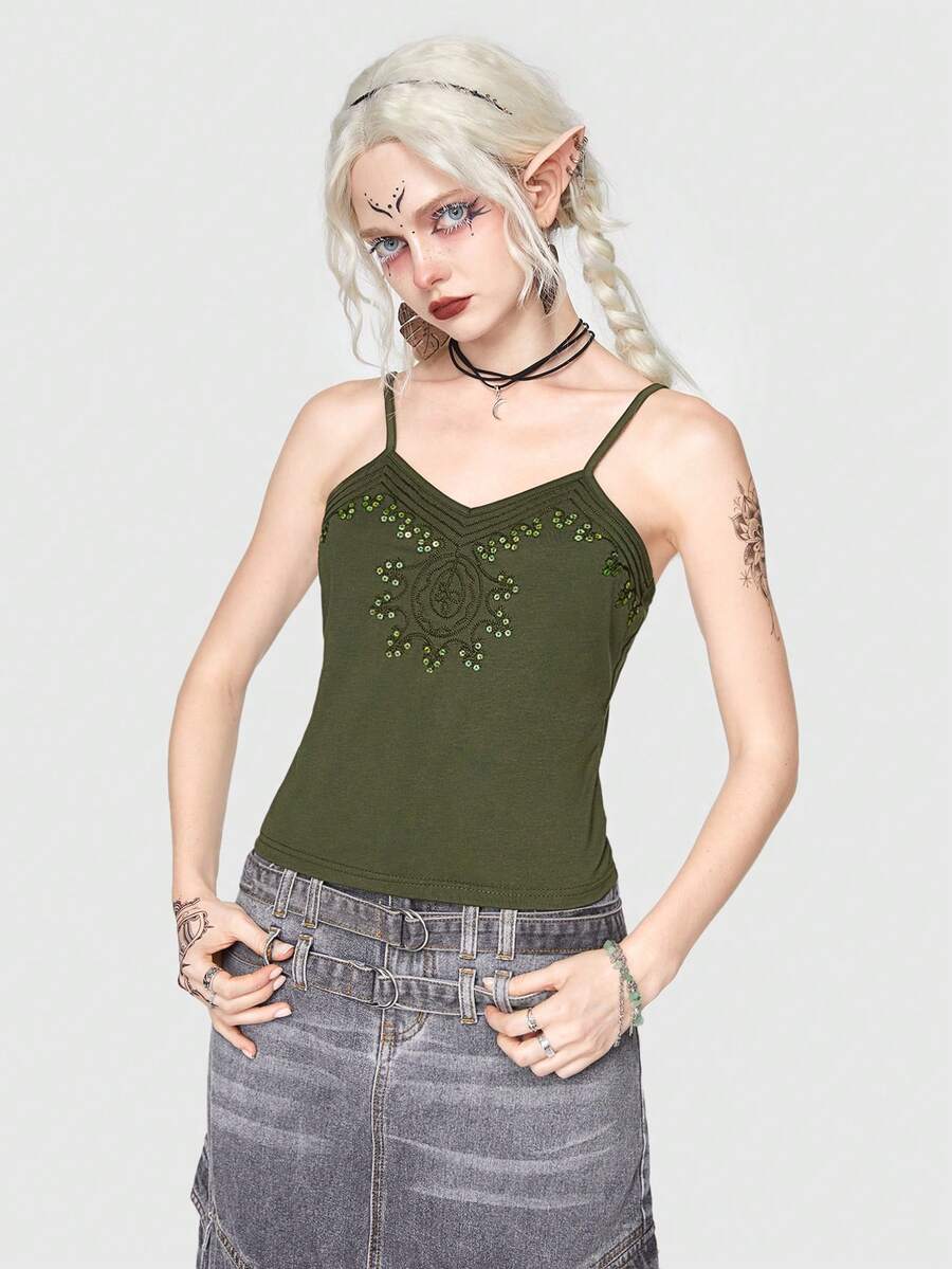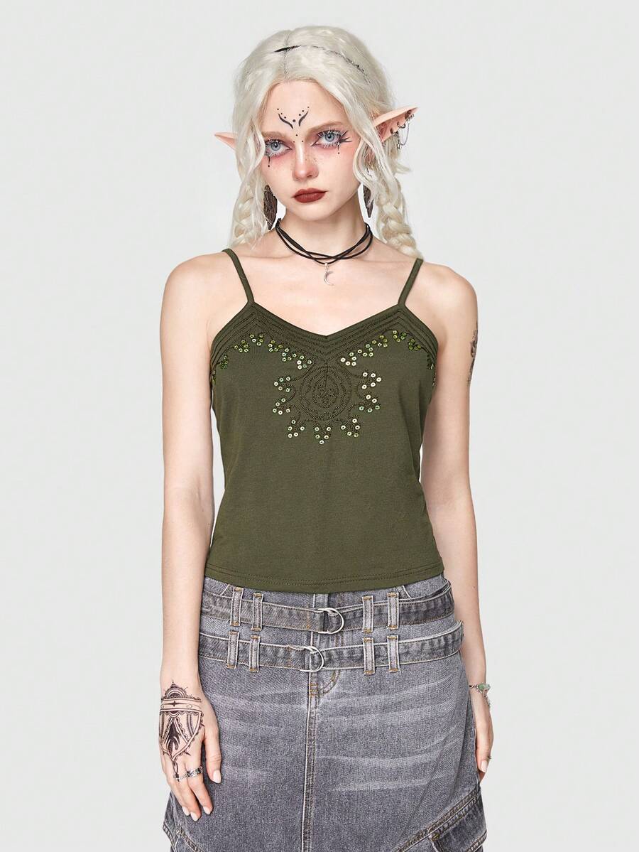 Fairycore Top de tirantes con estampado de dibujo con lentejuela en contraste
