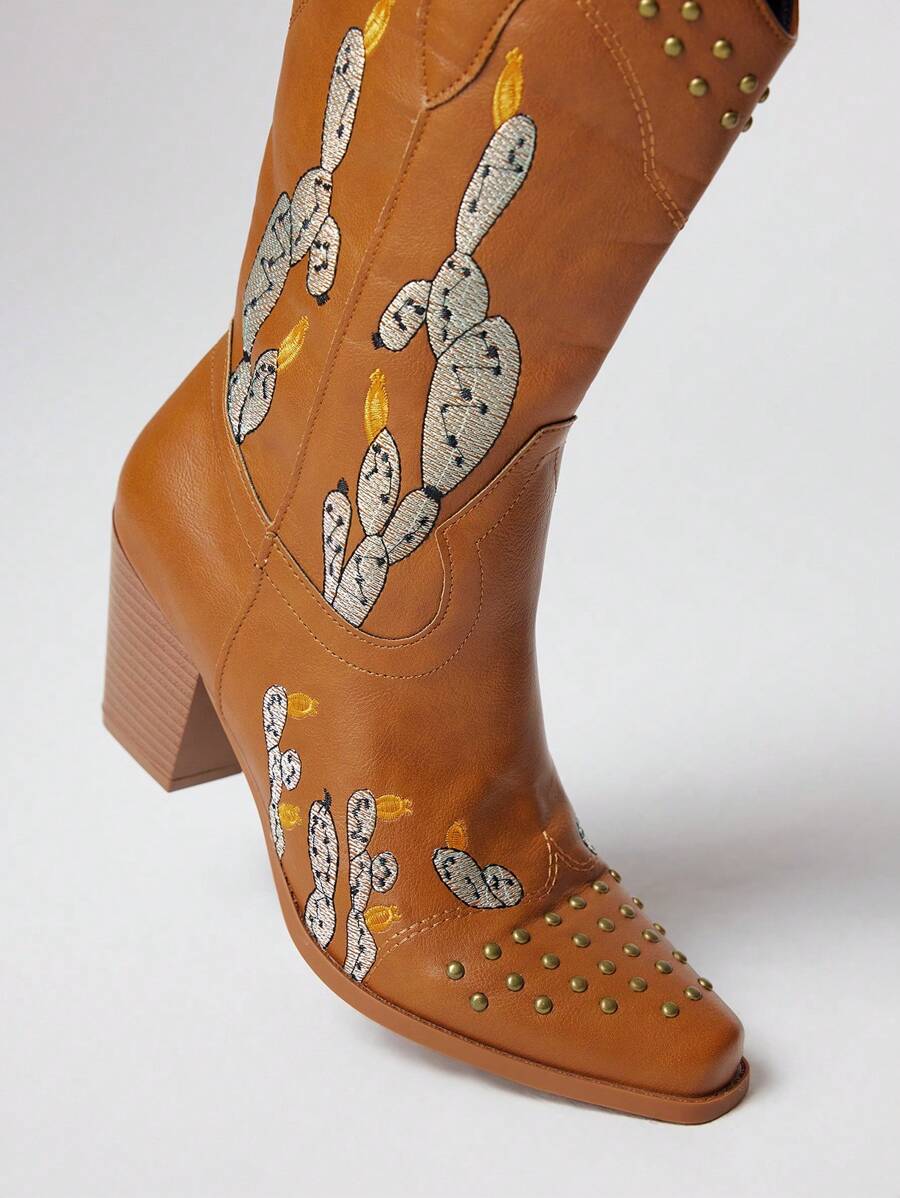 Fairycore Botas de vaquera para mujer, de slip-on, con detalles de bloque de color y bordados, botas campestres de moda casual y de montar hasta la rodilla para exteriores