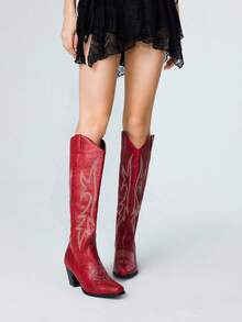 Fairycore Botas de vaquera para mujer, de estilo slip-on y pull-on, con detalles en vino tinto con bordados, botas occidentales, moda casual para exteriores de caña alta