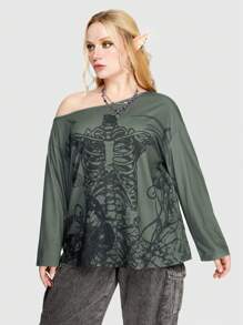 Fairycore Camiseta De Talla Grande Para Mujer Con Escote Asimétrico Y Patrón De Calavera Y Mariposa