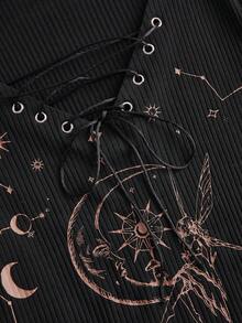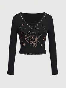Fairycore Camiseta Gráfica Mujeres Estrellas Y Luna Con Encaje En El Dobladillo