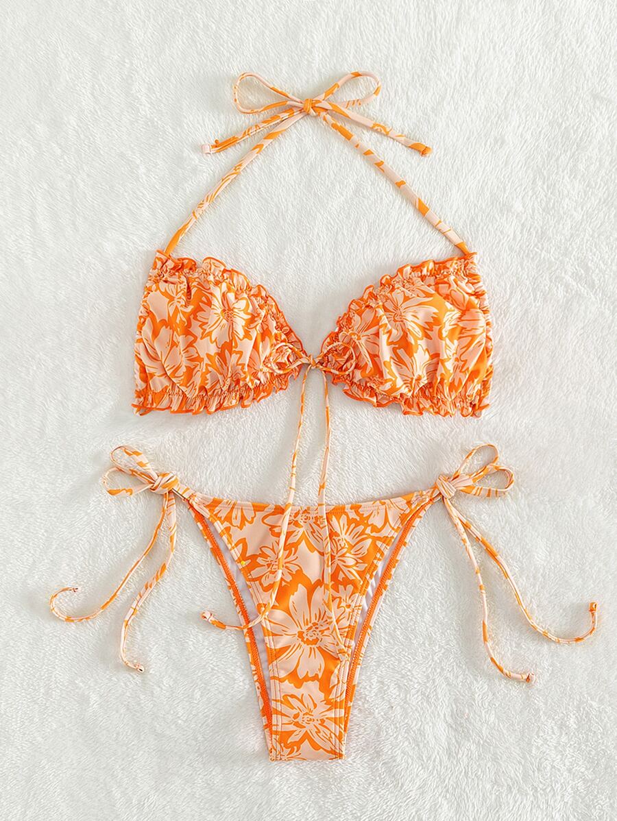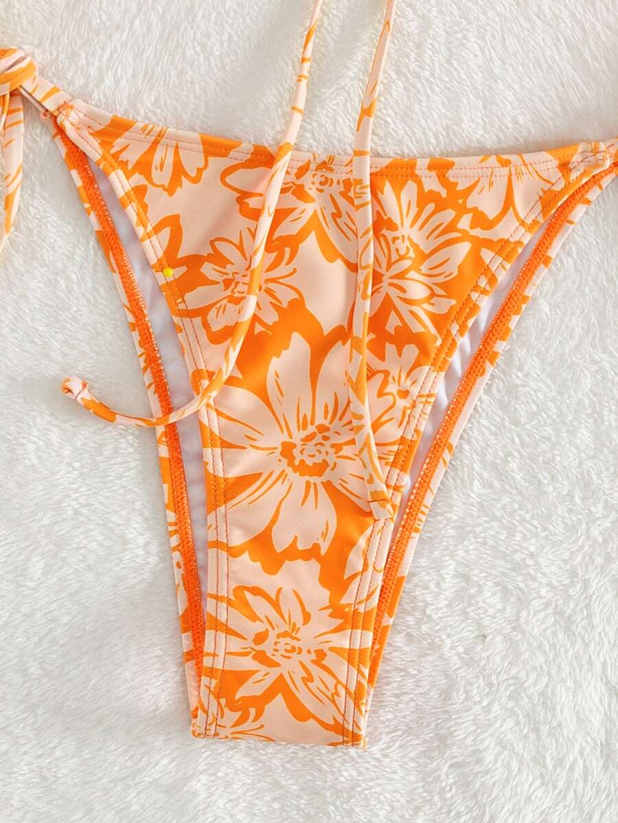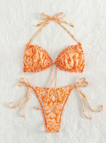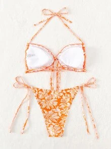 Conjunto bikini de playa de verano con estampado floral y lazos en los lados